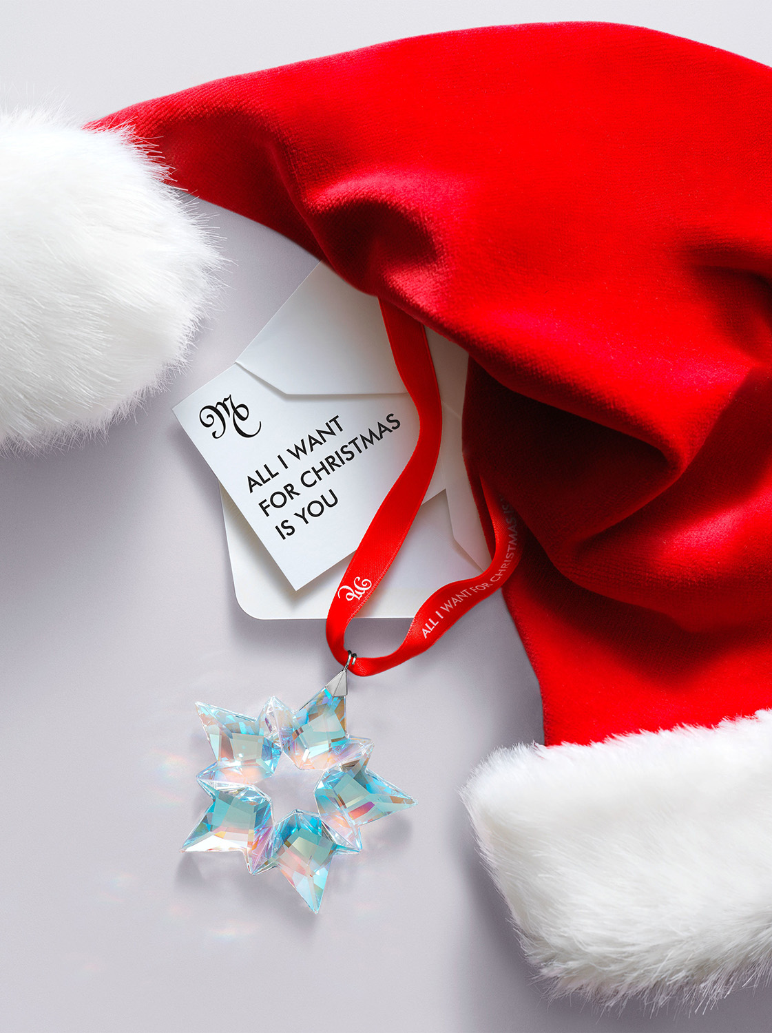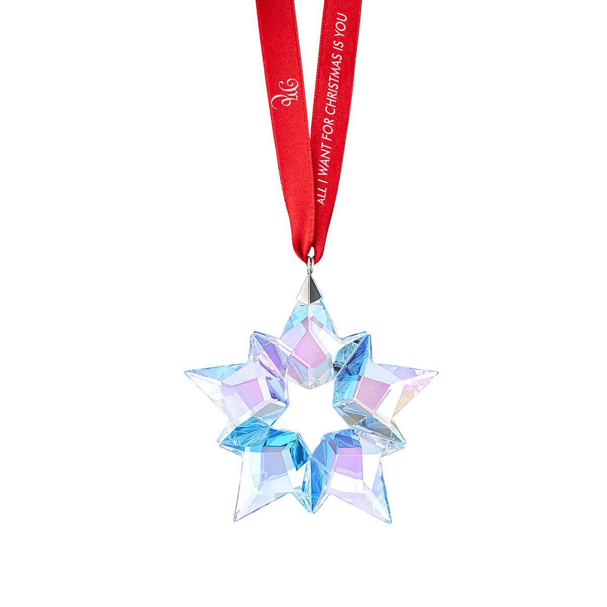 This new and exclusive addition to the collection is the epitome of stylish, festive décor. Ninety beautifully crafted Swarovski crystal facets shimmer with the blue Aurora Boreale color effect. Hung on a red satin ribbon, the ornament is detailed with “All I Want For Christmas Is You” and Mariah Carey's initials. The ornament comes in a beautifully designed, blue triangular Swarovski gift box complete with Mariah Carey's initials embossed on the front.