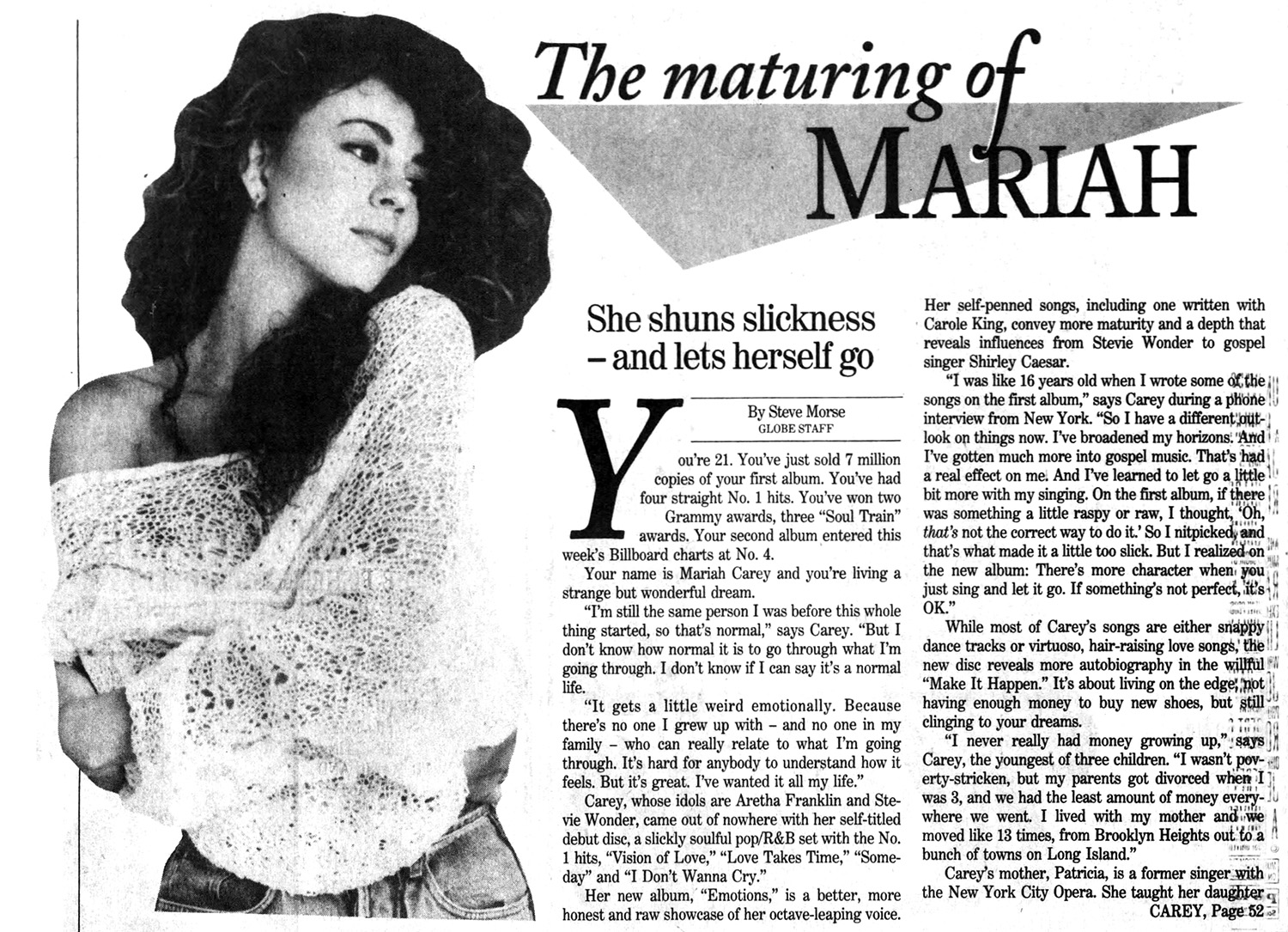 Carey, whose idols are Aretha Franklin and Stevie Wonder, came out of nowhere with her debut disc, Mariah Carey, a slickly soulful pop/R&B set with those four No. 1 hits, “Vision of Love,” “Love Takes Time,” “Someday” and “I Don't Wanna Cry.”