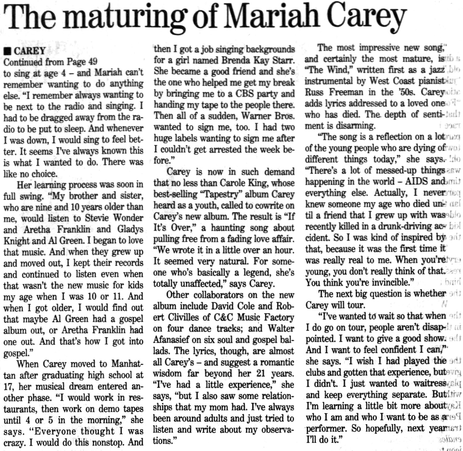 Collaborators on the new album include David Cole and Robert Clivilles of C&C Music Factory on four dance tracks; and Walter Afanasieff on six soul and gospel ballads. The lyrics are almost all Carey's — and suggest a wisdom far beyond her 21 years.