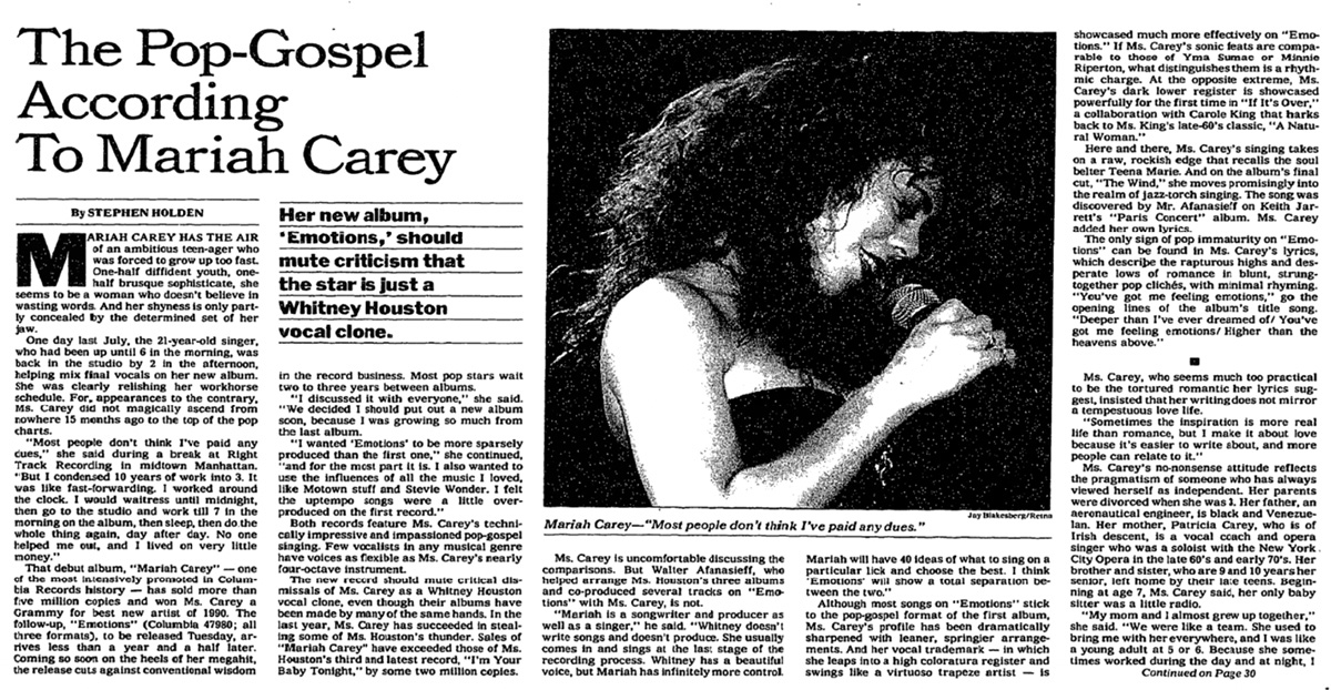 Although most songs on Emotions stick to the pop-gospel format of the first album, Ms. Carey's profile has been dramatically sharpened with leaner, springier arrangements. And her vocal trademark — in which she leaps into a high coloratura register and swings like a virtuoso trapeze artist — is showcased much more effectively on Emotions. If Ms. Carey's sonic feats are comparable to those of Yma Sumac or Minnie Riperton, what distinguishes them is a rhythmic charge. At the opposite extreme, Ms. Carey's dark lower register is showcased powerfully for the first time in “If It's Over,” a collaboration with Carole King that harks back to Ms. King's late-60's classic, “A Natural Woman.”