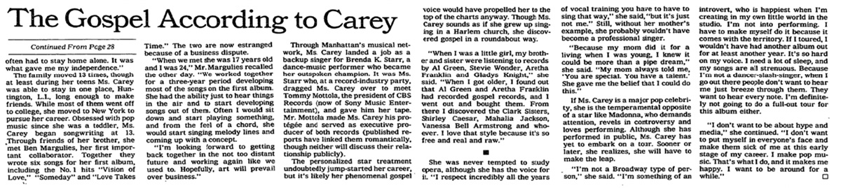 The personalized star treatment undoubtedly jump-started her career, but it's likely her phenomenal gospel voice would have propelled her to the top of the charts anyway. Though Ms. Carey sounds as if she grew up singing in a Harlem church, she discovered gospel in a roundabout way.