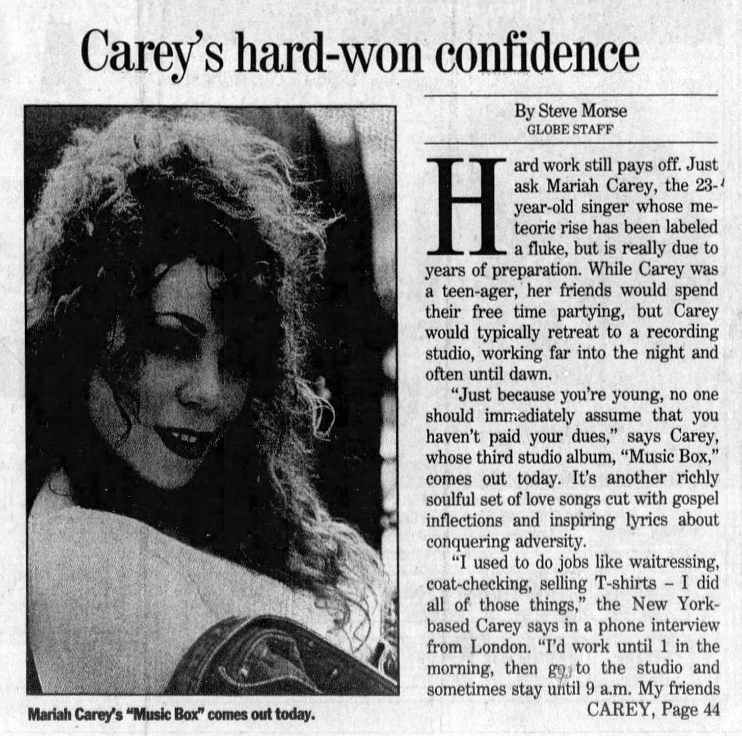 Carey, the daughter of a Venezuelan father and a mother from Ireland, grew up shy and alienated, partly because her mixed ancestry was derided at school and partly because her mother moved 13 times during Carey's chaotic youth. That's why Carey preferred the sheltered, late-night studio path (making a demo tape that finally caught the ear of Sony executives) instead of first trying to make a name in the clubs.