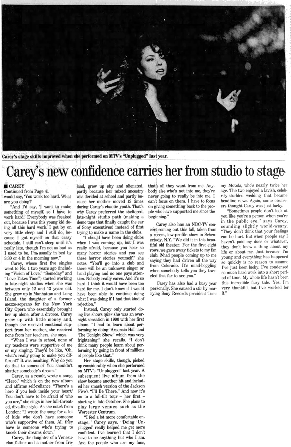 Carey, whose first five singles went to No. 1 two years ago (including “Vision of Love,” “Someday” and “Love Takes Time”) started working in late-night studios when she was between only 12 and 13 years old. She grew up in Manhattan and Long Island, the daughter of a former mezzo-soprano for the New York City Opera who essentially brought her up alone, after a divorce. Carey grew up with little money and, though she received emotional support from her mother, she received none from her teachers, she says.