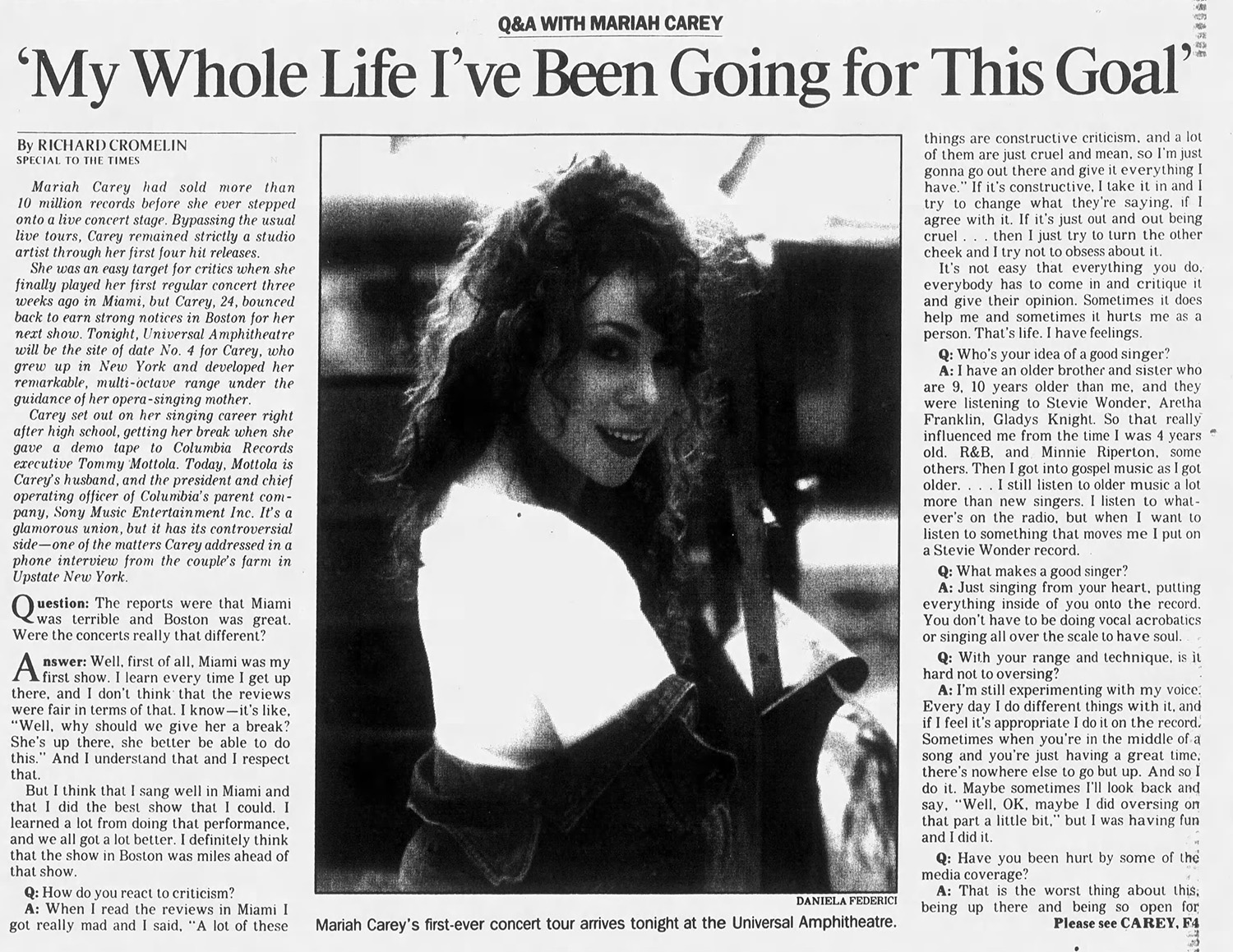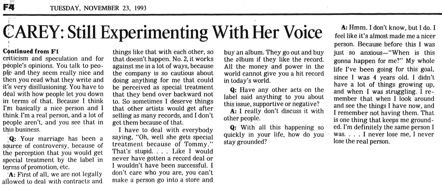 Carey set out on her singing career right after high school, getting her break when she gave a demo tape to Columbia Records executive Tommy Mottola. Today, Mottola is Carey's husband, and the president and chief operating officer of Columbia's parent company, Sony Music Entertainment Inc. It's a glamorous union, but it has its controversial side — one of the matters Carey addressed in a phone interview from the couple's farm in Upstate New York.