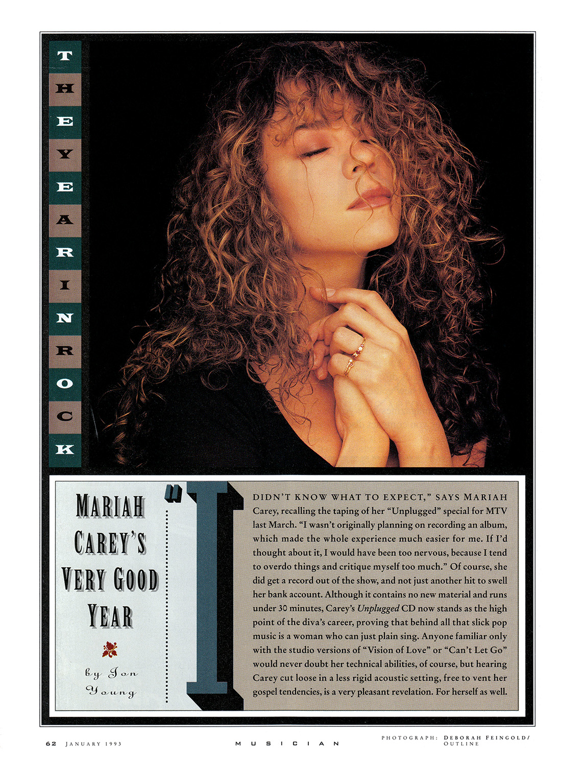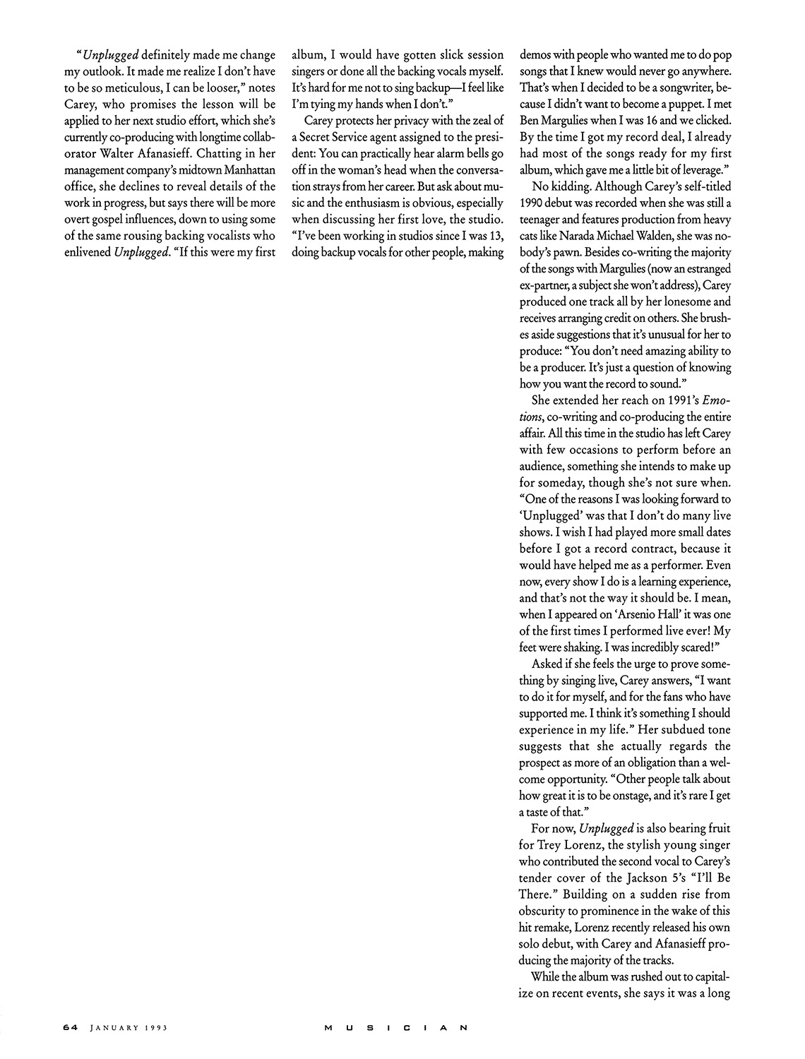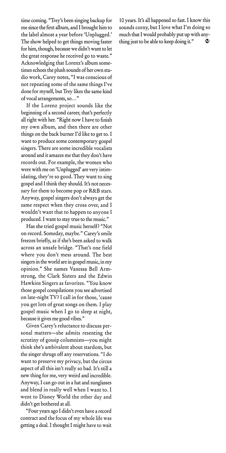 “Unplugged definitely made me change my outlook. It made me realize I don't have to be so meticulous, I can be looser,” notes Carey, Carey protects her privacy with the zeal of a Secret Service agent assigned to the presi-dent: You can practically hear alarm bells go off in the woman's head when the conversation strays from her career. But ask about music and the enthusiasm is obvious, especially when discussing her first love, the studio. Unplugged. “If this were my first album, I would have gotten slick session singers or done all the backing vocals myself. It's hard for me not to sing backup — I feel like I'm tying my hands when I don't.”