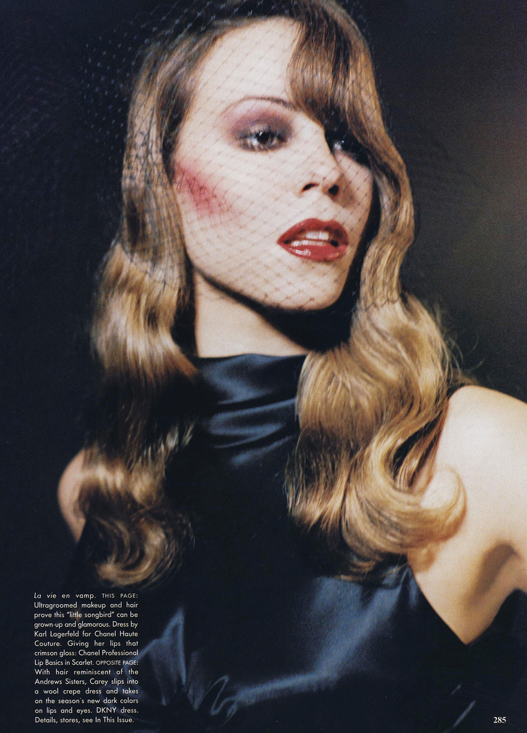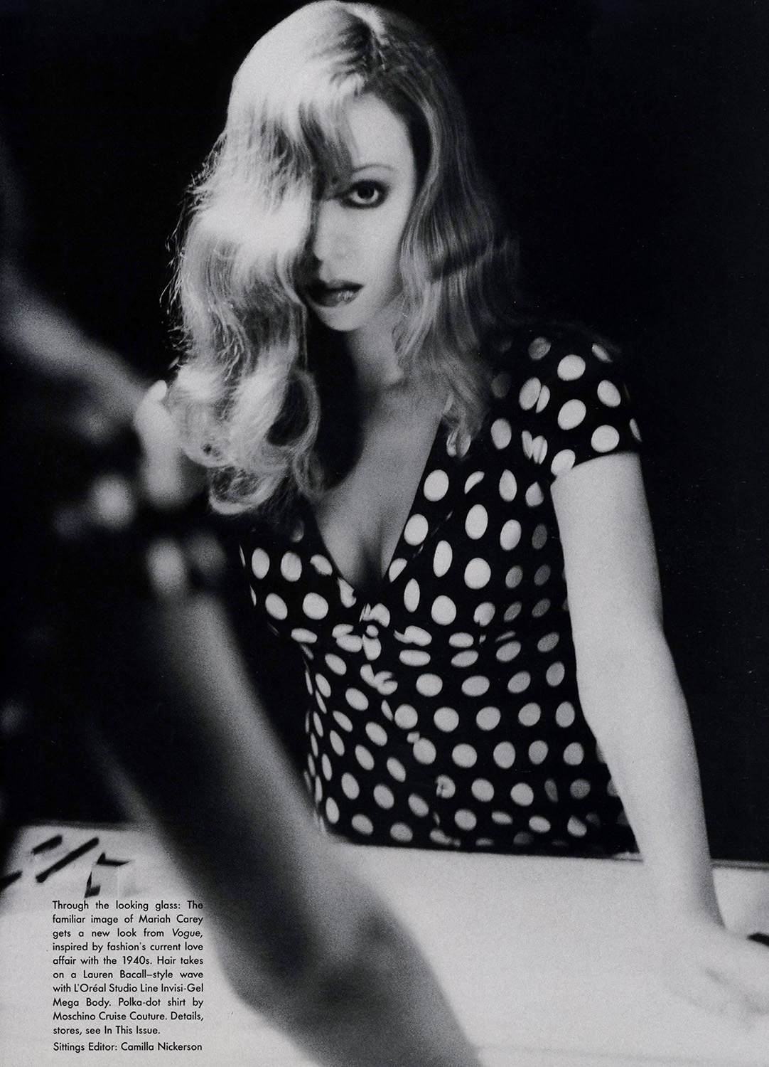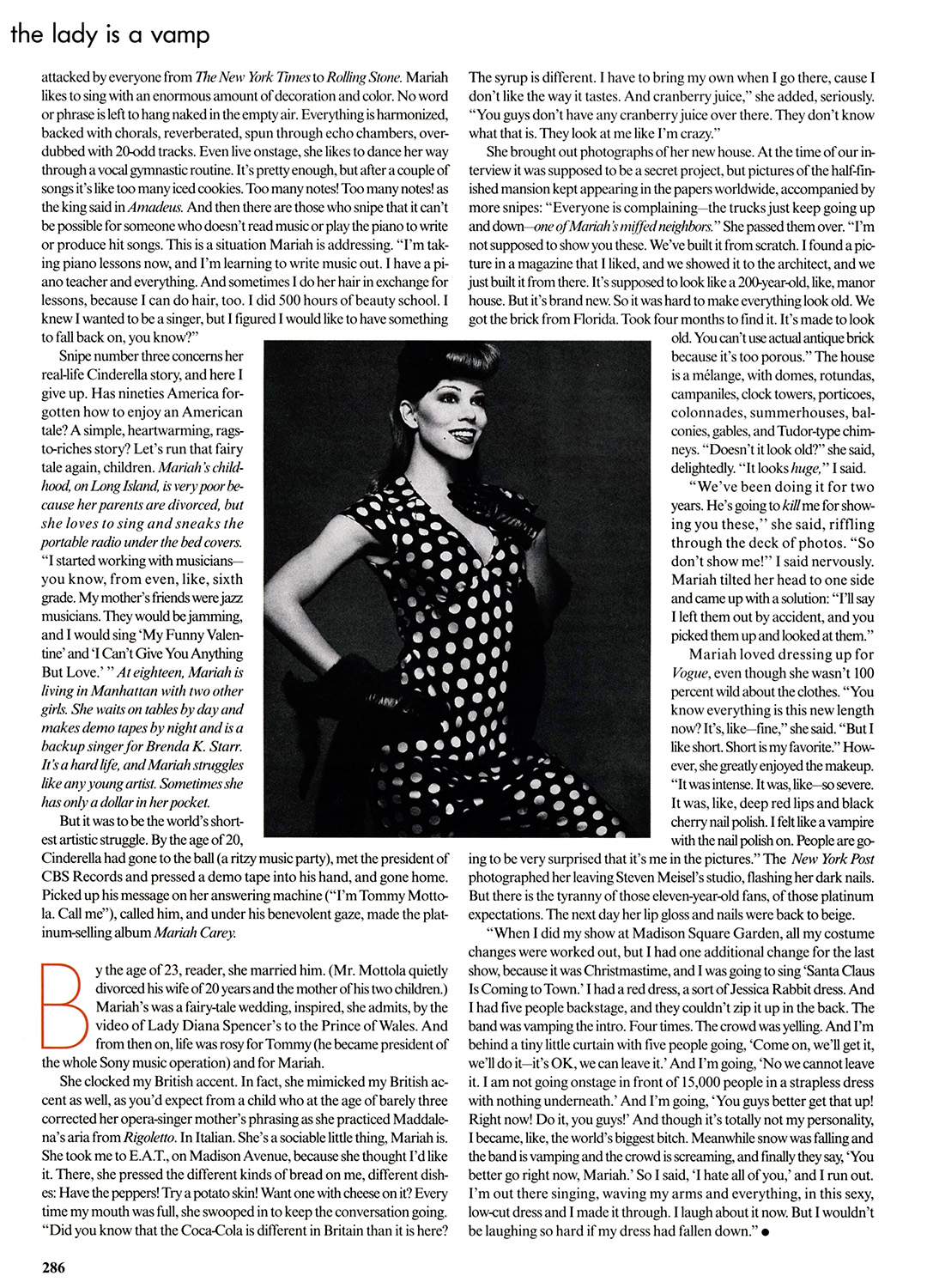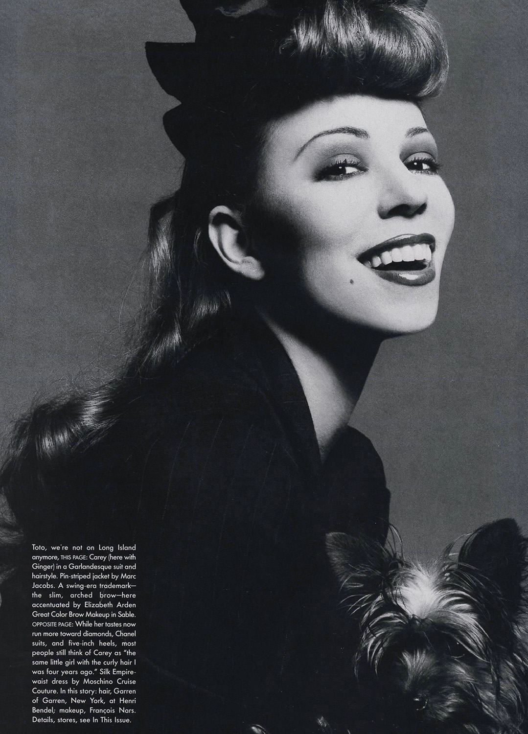 Mariah loved dressing up for Vogue, even though she wasn't 100 percent wild about the clothes. “You know everything is this new length now? It's, like — fine,” she said. “But I like short. Short is my favorite.” However, she greatly enjoyed the makeup. “It was intense. It was, like — so severe. It was, like, deep red lips and black cherry nail polish. I felt like a vampire with the nail polish on. People are going to be very surprised that it's me in the pictures.” The New York Post photographed her leaving Steven Meisel's studio, flashing her dark nails. But there is the tyranny of those eleven-year-old fans, of those platinum expectations. The next day her lip gloss and nails were back to beige.