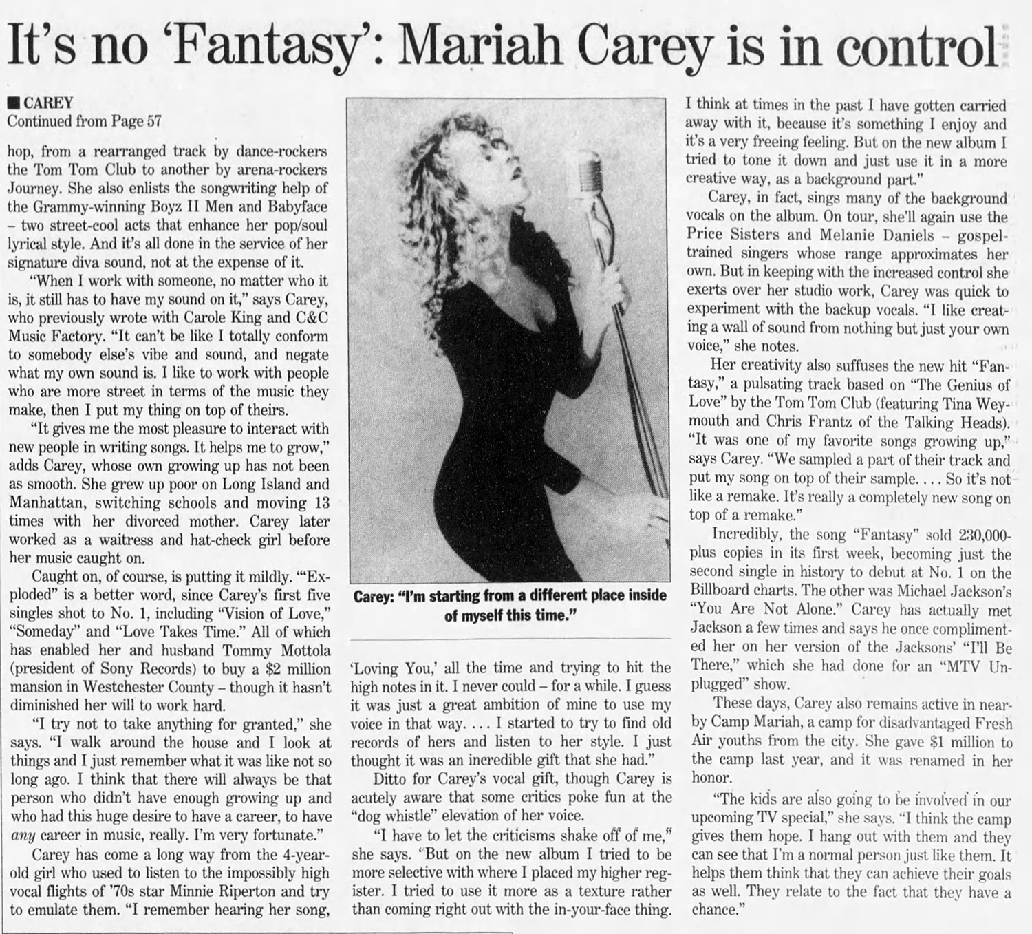 Carey is definitely more self-assured and relaxed on her new album, which just spun off a No. 1 single in the dance-propelled “Fantasy.” As she says: “I really tried to let myself go and not edit myself too much this time; and to play with different melodies more.”