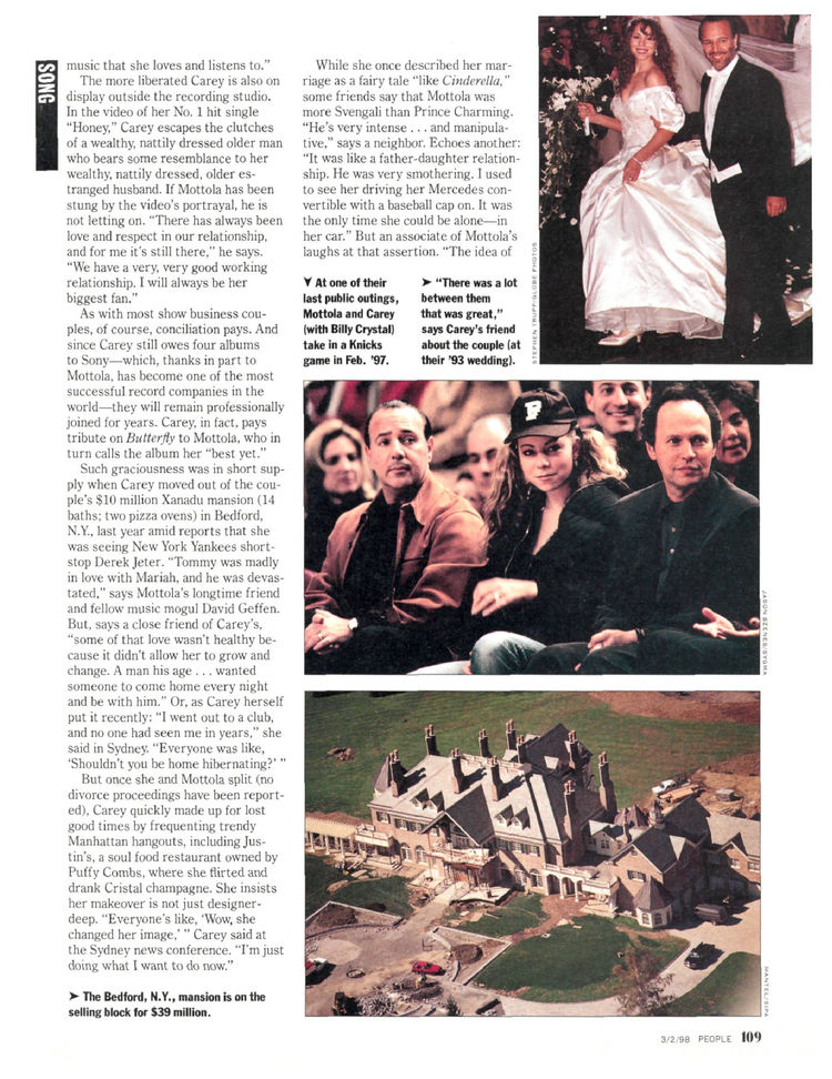While she once described her marriage as a fairy tale “like Cinderella,” some friends say that Mottola was more Svengali than Prince Charming. “He's very intense… and manipulative,” says a neighbor. Echoes another: “It was like a father-daughter relationship. He was very smothering. I used to see her driving her Mercedes convertible with a baseball cap on. It was the only time she could be alone — in her car.” But an associate of Mottola's laughs at that assertion. “The idea of her playing the innocent who has broken away from the controlling husband is bulls--t,” he says. “She was no innocent.” The portrayal of Carey as the prisoner of Bedford especially rankles Mottola, another associate says: “It's the biggest crock he's ever heard. Mariah is a strong-willed, intelligent, talented woman. She came and went as she pleased.” In that, Mottola has a surprising ally. Patricia Carey, Mariah's mother, disputes that her son-in-law was overly possessive. “I did not see that,” she says.