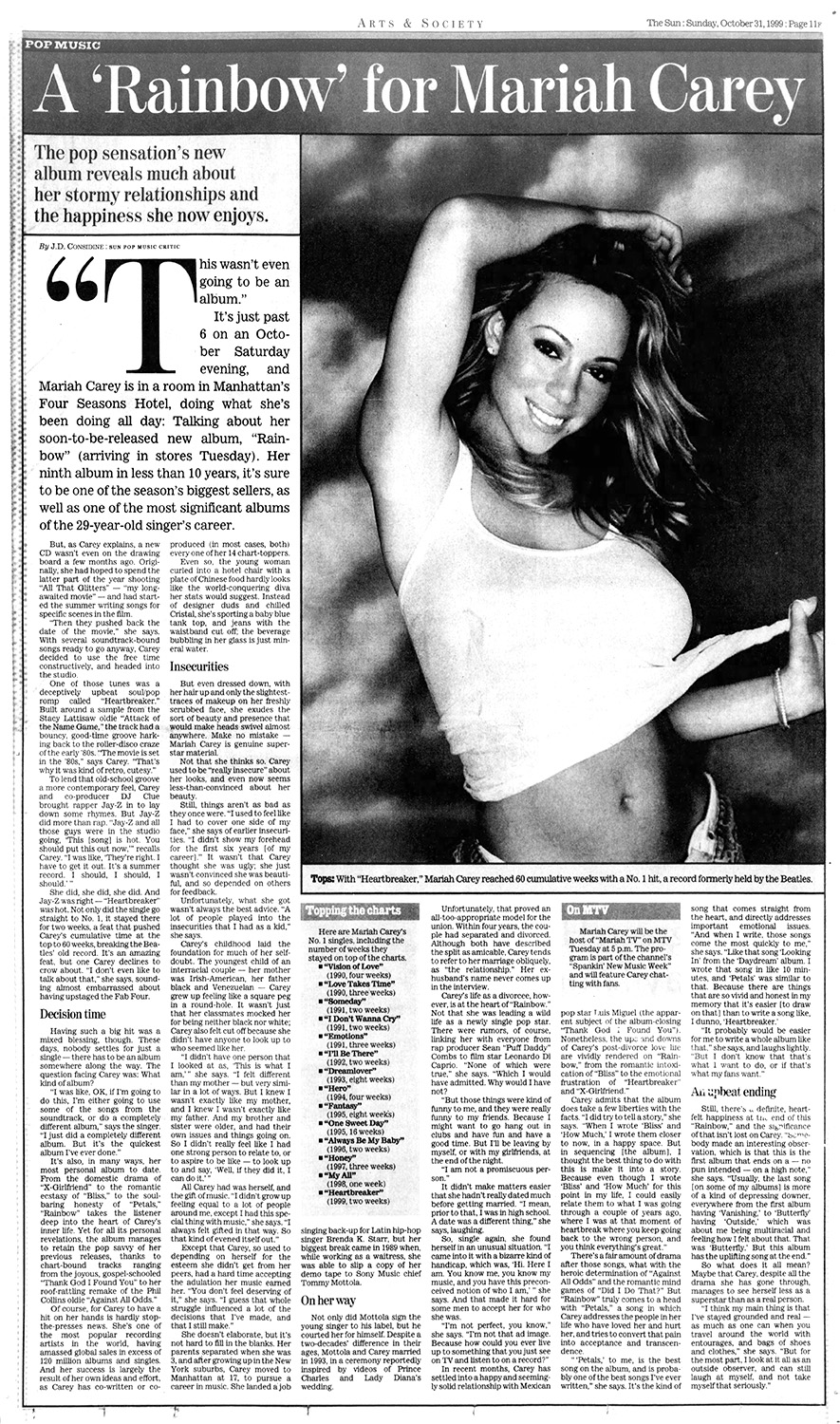 It's just past 6 on an October Saturday evening, and Mariah Carey is in a room in Manhattan's Four Seasons Hotel, doing what she's been doing all day: Talking about her soon-to-be-released new album, Rainbow (arriving in stores Tuesday). Her ninth album in less than 10 years, it's sure to be one of the season's biggest sellers, as well as one of the most significant albums of the 29-year-old singer's career.