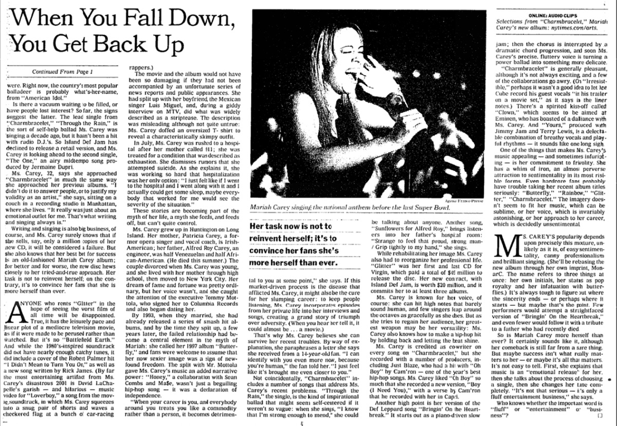 That's why Ms. Carey believes she can survive her recent troubles. By way of explanation, she paraphrases a letter she says she received from a 14-year-old fan. “I can identify with you even more now, because you're human,” the fan told her. “I just feel like it's brought me even closer to you.”