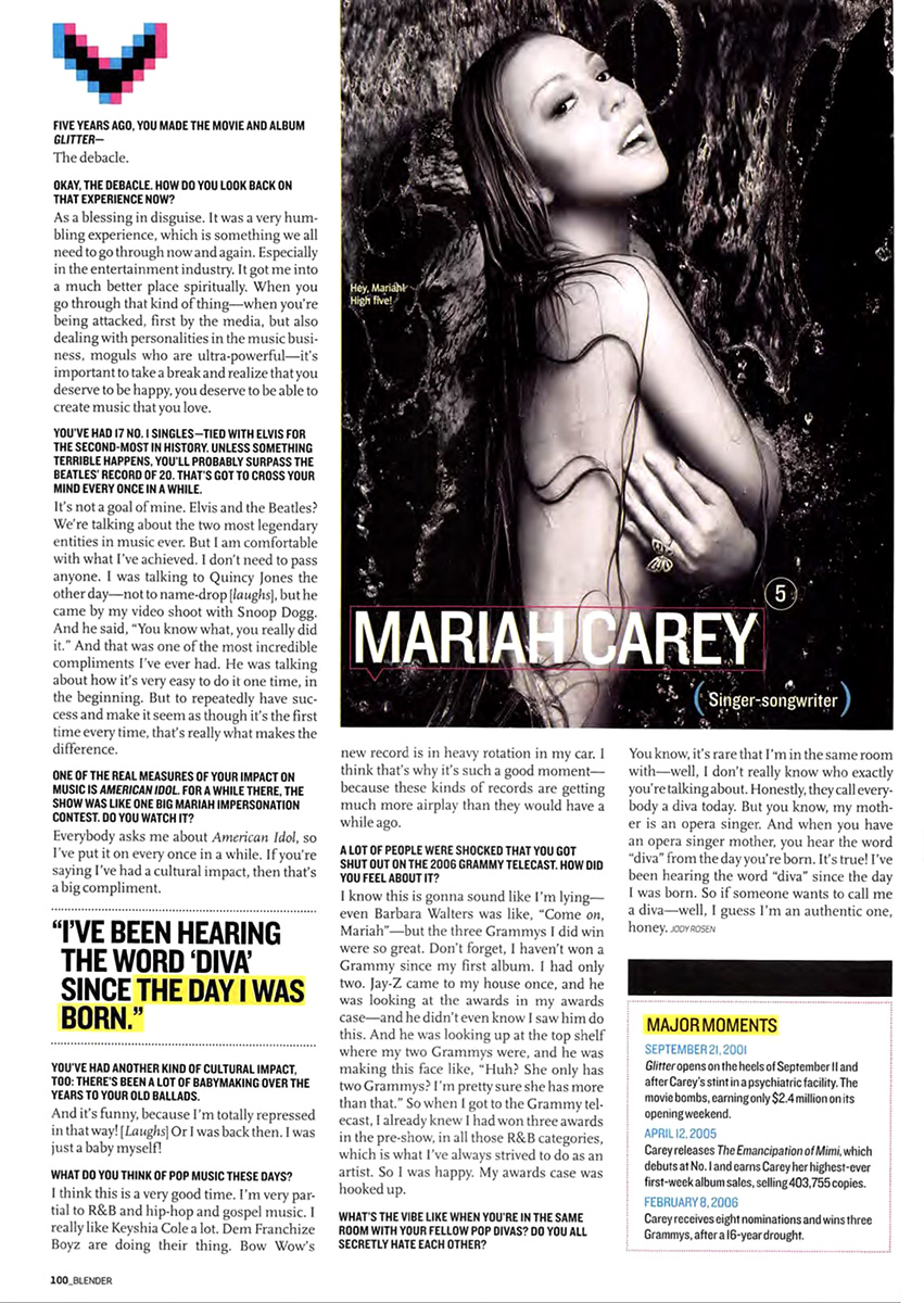 I know this is gonna sound like I'm lying — even Barbara Walters was like, “Come on, Mariah” — but the three Grammys I did win were so great. Don't forget, I haven't won a Grammy since my first album. I had only two. Jay-Z came to my house once, and he was looking at the awards in my awards case — and he didn't even know I saw him do this. And he was looking up at the top shelf where my Grammys were, and he was making this face like, “Huh? She only has two Grammys? I'm pretty sure she has more than that.” So when I got to the Grammy telecast, I already knew I had won three awards in the pre-show, in all those R&B categories, which is what I've always strived to do as an artist. So I was happy. My awards case was hooked up.