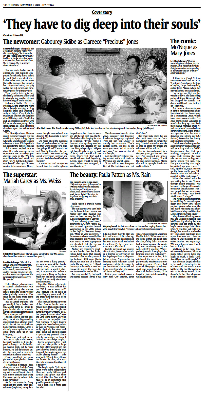 As he says of his cast, “They gave me a miracle, they gave me my truth.” Here is the truth behind how each actress defied expectations as a victimized daughter (Gabourey Sidibe), a monstrous mother (Mo'Nique), a selfless teacher (Paula Patton) and a weary social worker (Carey).