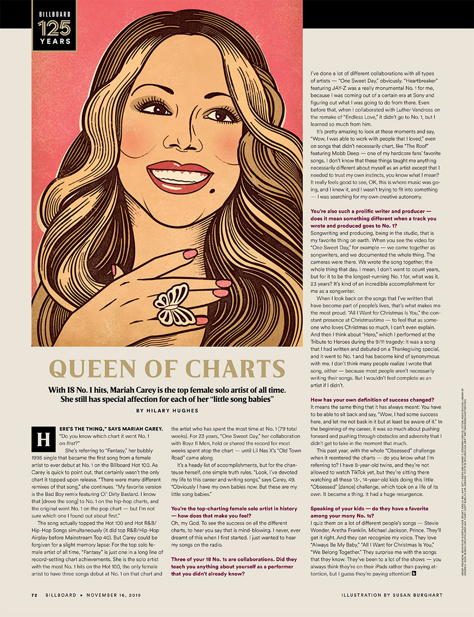 She's referring to “Fantasy,” her bubbly 1995 single that became the first song from a female artist to ever debut at No. 1 on the Billboard Hot 100. As Carey is quick to point out, that certainly wasn't the only chart it topped upon release. “There were many different remixes of that song,” she continues. “My favorite version is the Bad Boy remix featuring Ol' Dirty Bastard. I know that [drove the song] to No. 1 on the hip-hop charts, and the original went No. 1 on the pop chart — but I'm not sure which one I found out about first.”