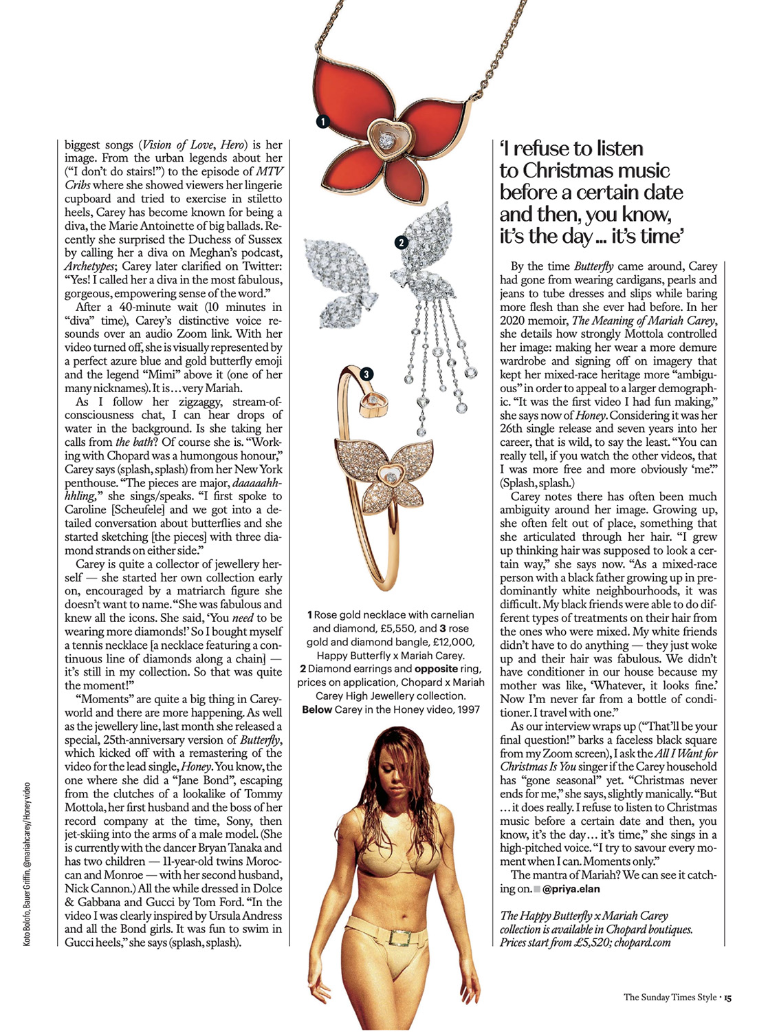 “Moments” are quite a big thing in Carey-world and there are more happening. As well as the jewellery line, last month she released a special, 25th-anniversary version of Butterfly, which kicked off with a remastering of the video for the lead single, “Honey.” You know, the one where she did a “Jane Bond”, escaping from the clutches of a lookalike of Tommy Mottola, her first husband and the boss of her record company at the time, Sony, then jet-skiing into the arms of a male model. (She is currently with the dancer Bryan Tanaka and has two children — 11-year-old twins Moroccan and Monroe — with her second husband, Nick Cannon.) All the while dressed in Dolce & Gabbana and Gucci by Tom Ford. “In the video I was clearly inspired by Ursula Andress and all the Bond girls. It was fun to swim in Gucci heels,” she says (splash, splash).