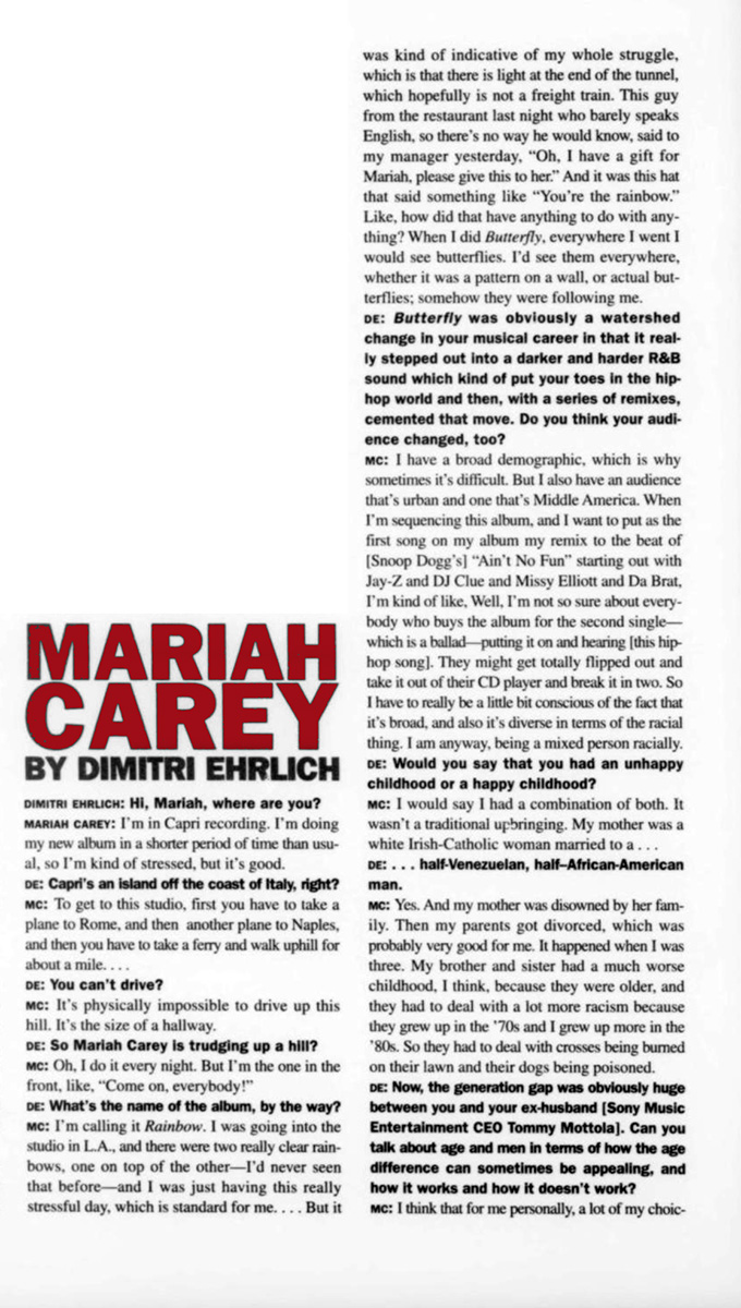 I'm calling it Rainbow. I was going into the studio in L.A., and there were two really clear rainbows, one on top of the other — I'd never seen that before — and I was just having this really stressful day, which is standard for me… But it was kind of indicative of my whole struggle, which is that there is light at the end of the tunnel, which hopefully is not a freight train. This guy from the restaurant last night who barely speaks English, so there's no way he would know, said to my manager yesterday, “Oh, I have a gift for Mariah, please give this to her.” And it was this hat that said something like, “You're the rainbow.” Like, how did that have anything to do with anything? When I did Butterfly, everywhere I went I would see butterflies. I'd see them everywhere, whether it was a pattern on a wall, or actual butterflies; somehow they were following me.