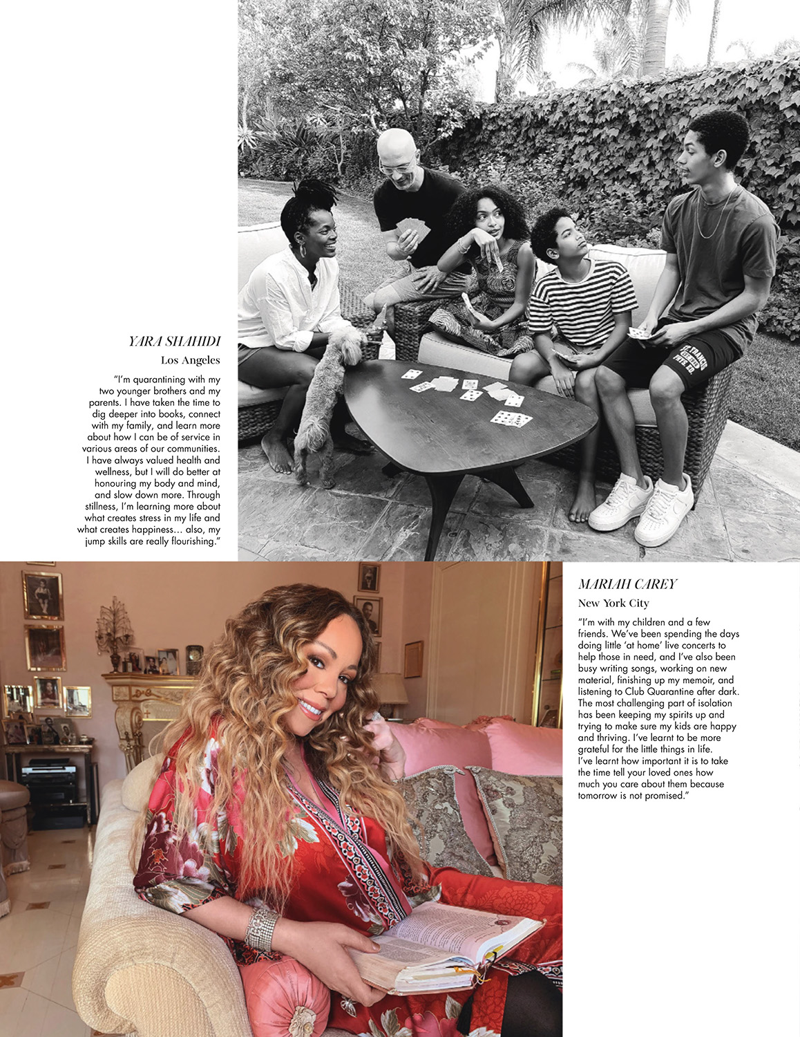 “I'm with my children and a few friends. We've been spending the days doing little ‘at home’ live concerts to help those in need, and I've also been busy writing songs, working on new material, finishing up my memoir, and listening to Club Quarantine after dark. The most challenging part of isolation has been keeping my spirits up and trying to make sure my kids are happy and thriving. I've learnt to be more grateful for the little things in life. I've learnt how important it is to take the time tell your loved ones how much you care about them because tomorrow is not promised.”