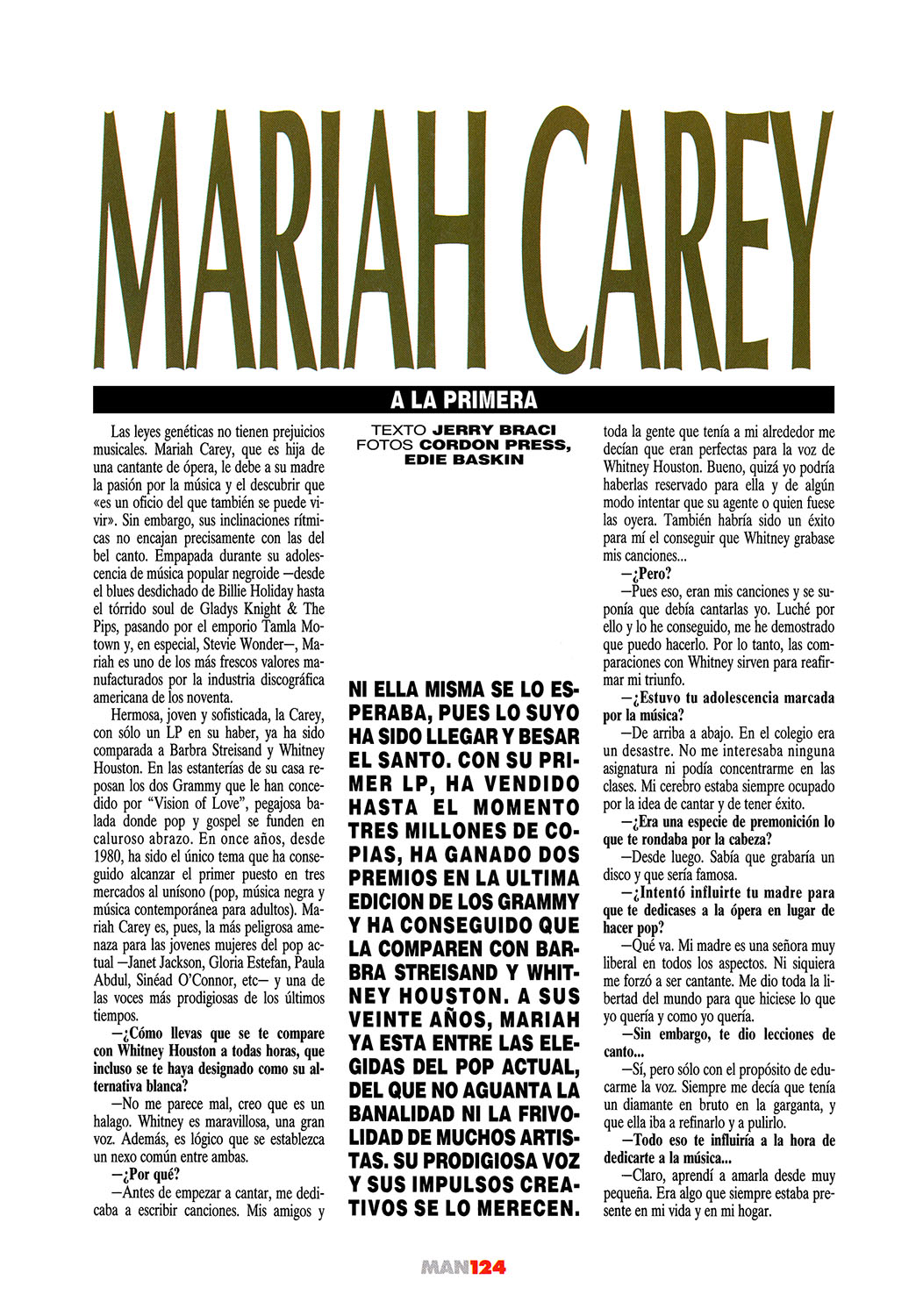 Hermosa, joven y sofisticada, la Carey, con sólo un LP en su haber, ya ha sido comparada a Barbra Streisand y Whitney Houston. En las estanterías de su casa reposan los dos Grammy que le han concedido por “Vision of Love,” pegajosa balada donde pop y gospel se funden en caluroso abrazo. En once años, desde 1980, ha sido el único tema que ha conseguido alcanzar el primer puesto en tres mercados al unísono (pop, música negra y música contemporánea para adultos). Mariah Carey es, pues, la más peligrosa amenaza para las jovenes mujeres del pop actual — Janet Jackson, Gloria Estefan, Paula Abdul, Sinéad O'Connor, etc — y una de las voces más prodigiosas de los últimos tiempos.