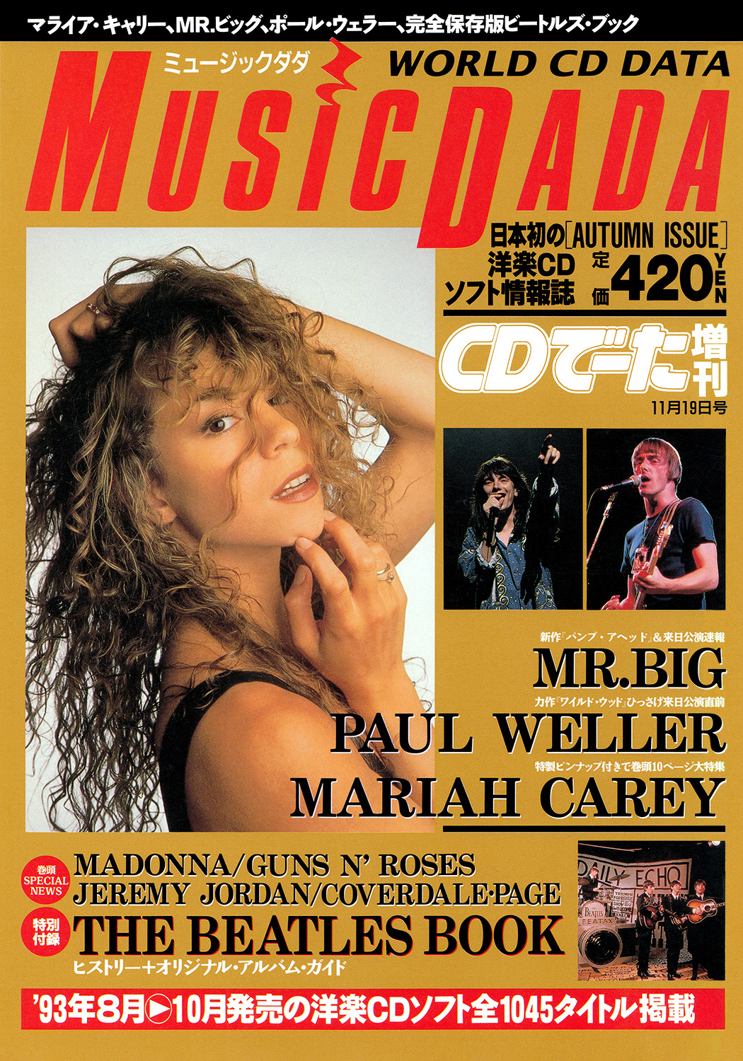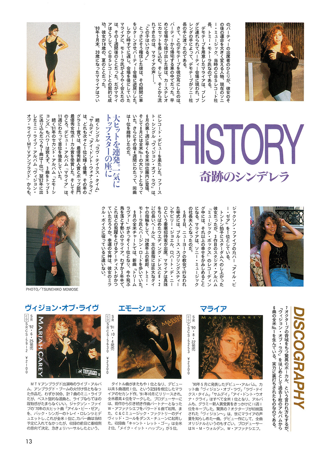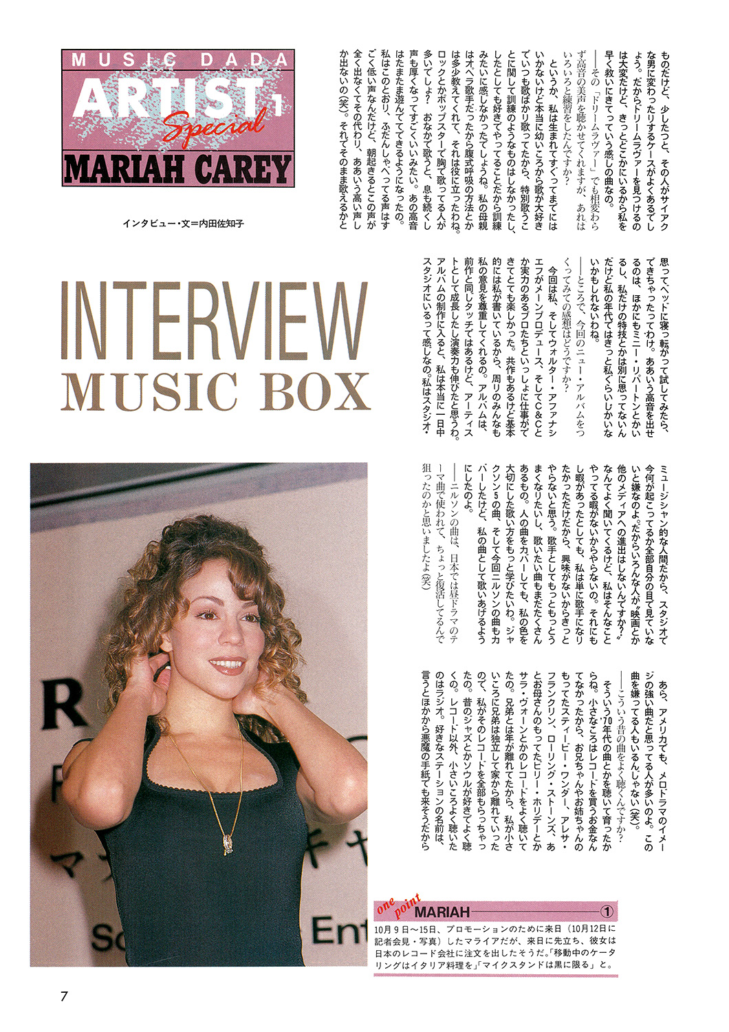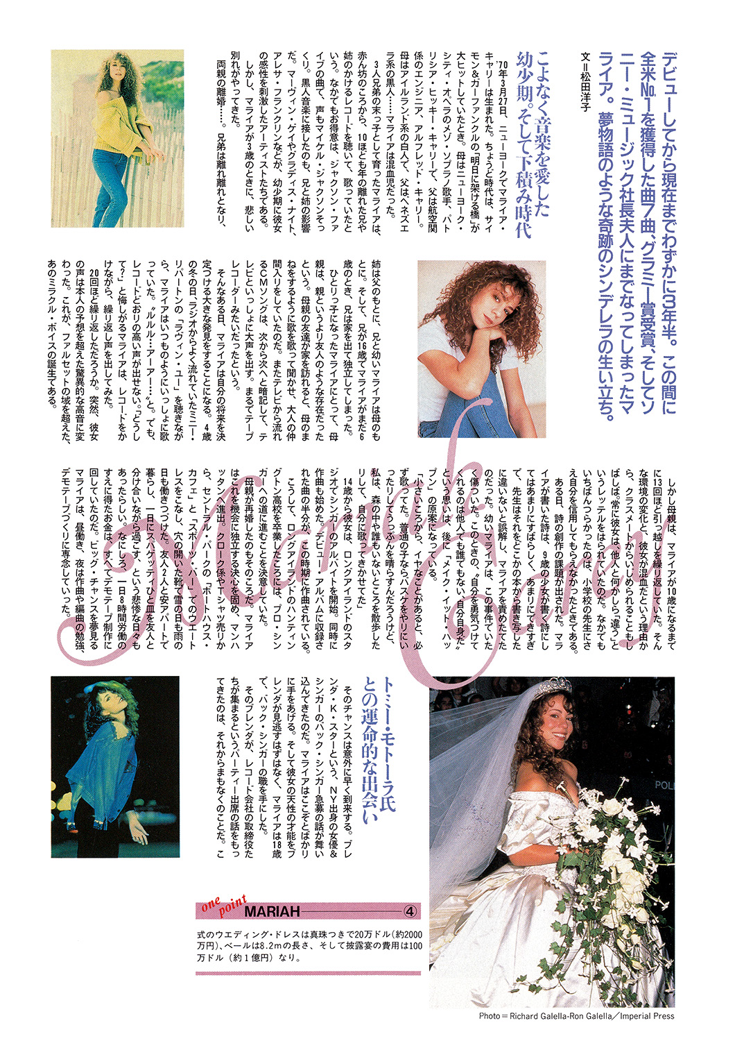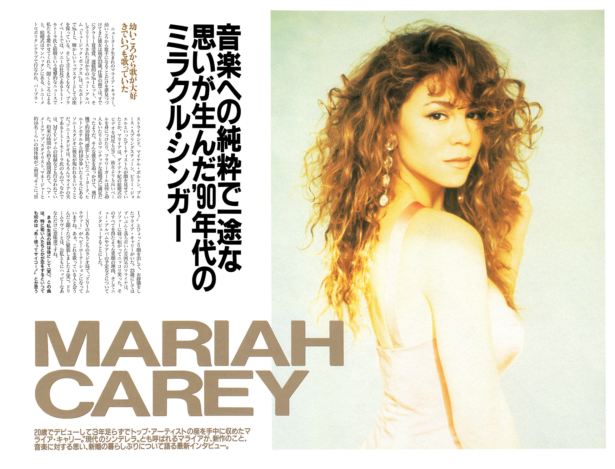 ニューヨーク生まれのマライア・キャリー。 幼いころから歌手になることだけを夢見つづけてきた彼女は現在23歳。仕事の面では、すでにグラミー賞受賞、連続的なNa1ヒット、そしてリリースされたばかりのニュー・アルバム『ミュージック・ボックス』は、ビルボードでMo1と、輝かしいトップスターとしての座を保っている。そして言うまでもなく、プライベートでは、ソニーの社長であるトミー・モトーラ氏と結婚という電撃的なニュースで私たちを驚かせてくれた。聞くところによると、結婚式はマンハッタンにある、トニーメトロポリタンクラブで行なわれ、バーブラ・ストライサンド、マイケル・ボルトン、ブルース・スプリングスティーン、ビリー・ジョエルといったアーティストらが顔を見せていたとか。マライアは、ダイアナ妃の結婚式のビデオを何度も見て、彼女よりも長いベールを身につけたり、フラワーガールは何と49人もいたりとロマンチックな結婚式に満足だったようだ。そんな彼女を追っかけて、飛行機で約10時間。滞在していたニューヨーク、ヒルトンホテルから約10分歩いたところにあるソニースタジオに彼女が現われるということだ。ソニースタジオは、もちろんマライアの夫であるトミー・モトーラ氏のもので、なかでは、MTVジャムの収録なども行なわれていた。約束の時間から約2時間遅れて、ヘア・メークアップ、スタイリスト、マネージャーと約10名くらいの団体様がご到着。そこに〝HI!〟とひょっこり顔を出して、お辞儀をしたマライア・キャリーがいた。23歳にしてはずいぶんと落ち着いた雰囲気のマライヤは、ソファーに寝っ転がってニッコリ笑った。そのすべてを得たような笑顔の理由、そしてニュー・アルバムやツアーの予定などについてインタビューすることにした。