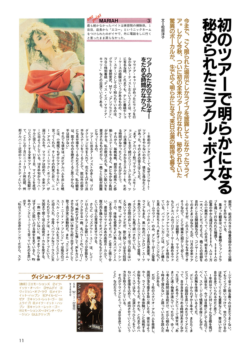 日本だけじゃなくて、アメリカでもコンサートらしいコンサートってやってないの。それは単に自分の中で準備ができてなかったからで、別にもったいぶってたとかいう意地悪な理由しゃないのよ。私は曲を書くことをメーンにやってたスタジオ・ミュージシャンだから、人の前で演奏することに慣れていないの。普通のミュージシャンは、その反対で、クラブとかでギグを重ねて曲を書くことを覚えていくって感しなんだろうけどね。私の場合、ソニーの社長との劇的な(笑)出会いのすえのデビューで〝現代のシンデレラ・ストーリー〟だって騒がれたから、アーシニオ・ホール・ショーとか、トゥナイト・ショーとかテレビに出る話ばかり来ちゃったの。コンサートをやらないでいたら、ロパクの噂も出るし。だからMTVのアンプラグド・ショーをやったときはすっきりしたわ。実はスゴ~く緊張してたんだけどね。初めて出たグラミー賞のときも、有名な大スターが私の横で〝何だこいつ〟って感しでじろじろ見てるから、緊張しまくったわ。でも今では人の前で歌うことに抵抗がなくなったし、自分は自分、私はマライア・キャリーだって自信がもてるようになったからね。コンサートは、シンプルにして私の歌に集中してもらいたいわ。