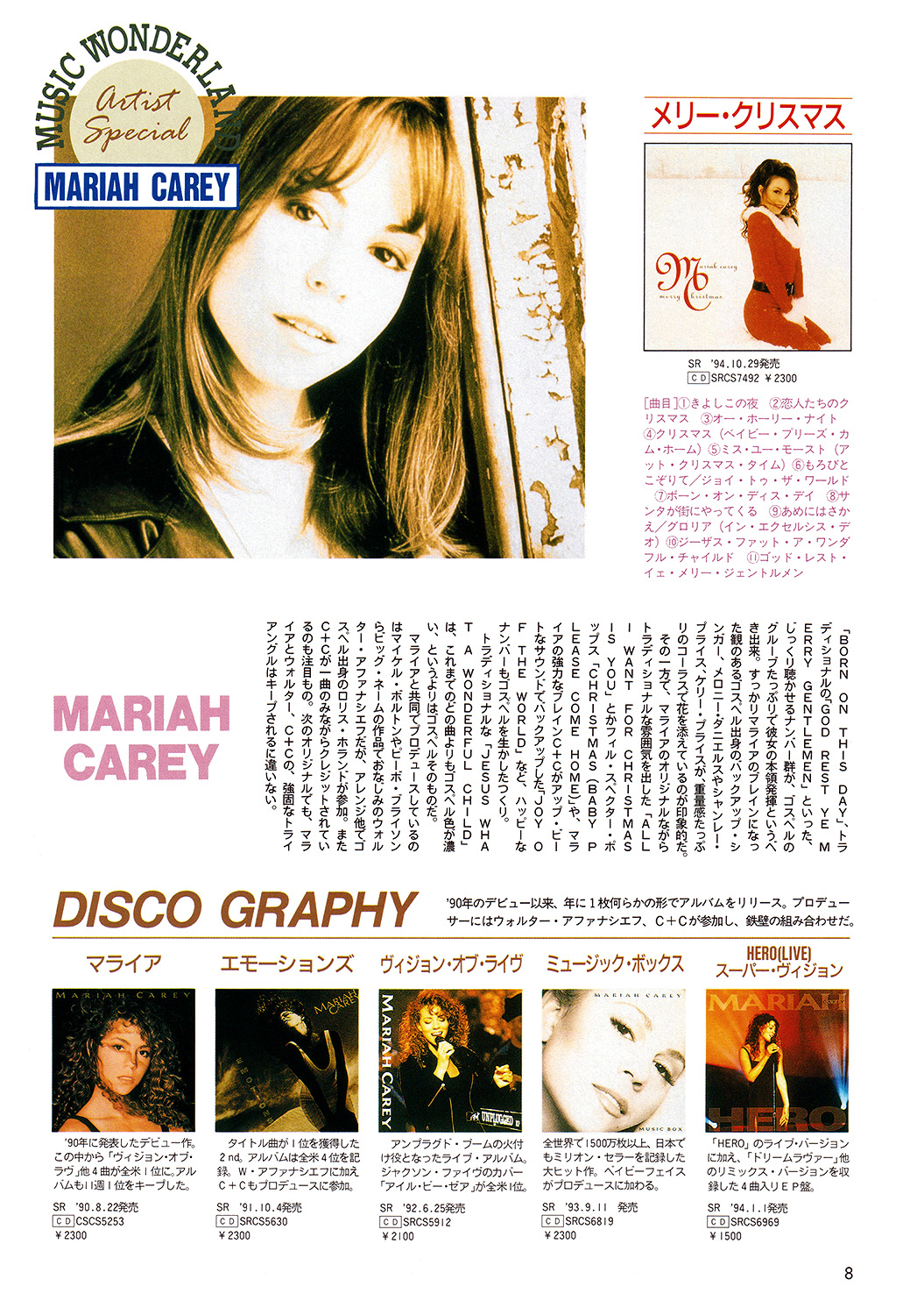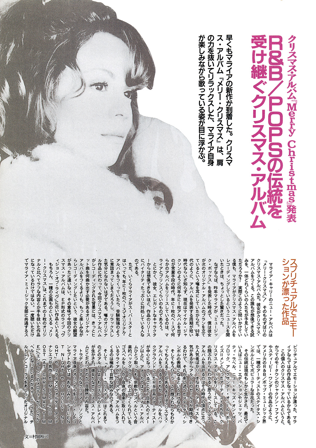 マライア・キャリーのニュー・アルバムは『メリー・クリスマス』!そのものずばりのクリスマス・アルバムだ。彼女がクリスマス・アルバムをつくる。この誰もが想像できる試みを、一体どれぐらいの人たちが予見していただろうか?実際このように問いかけている僕も、マライアがクリスマス・アルバムをレコーディングしているというニュースを聞いたときは、ちょっとした驚きだった。