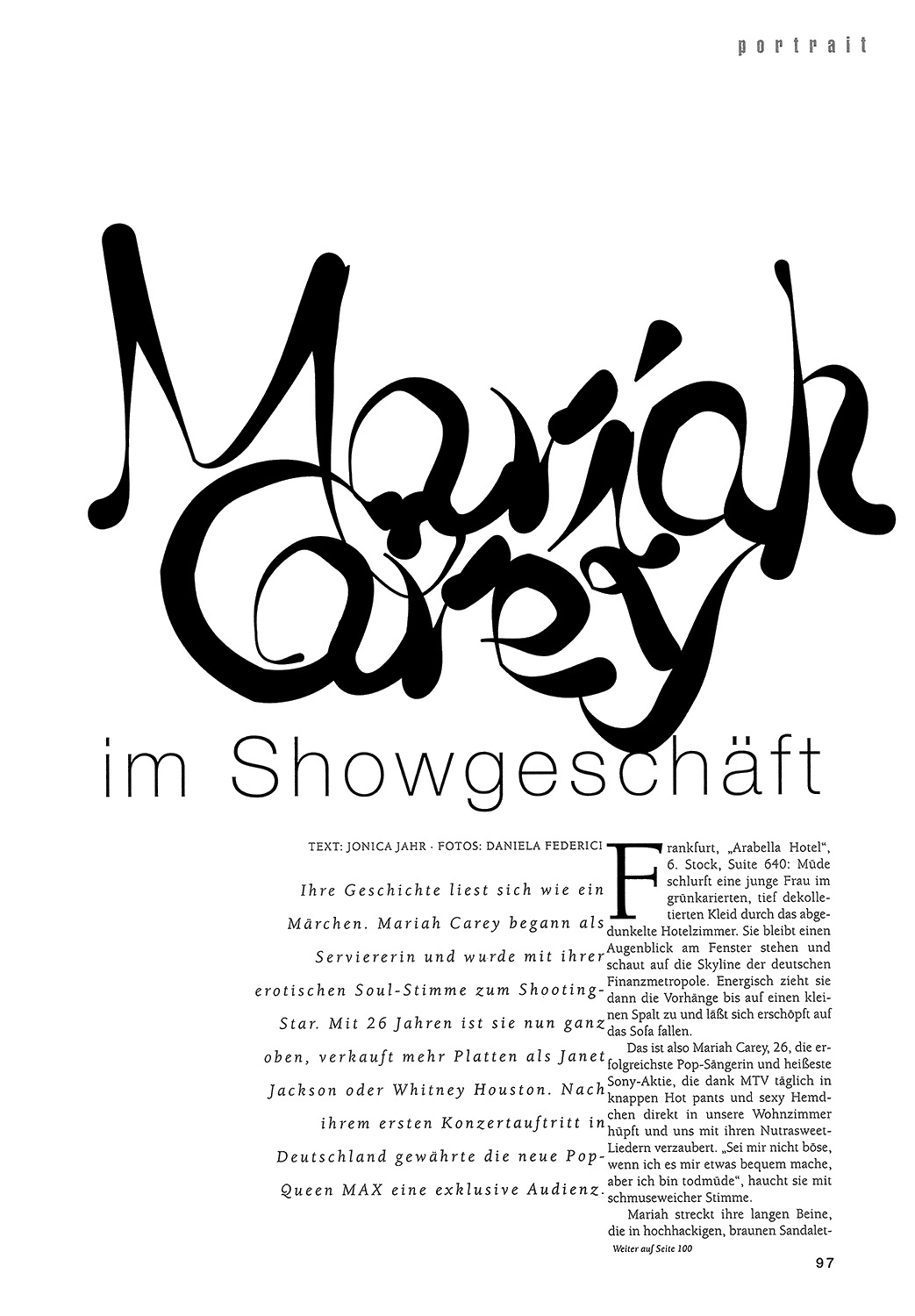 Mariah streckt ihre langen Beine, die in hochhackigen, braunen Sandaletten stecken, auf dem gläsernen Couchtisch aus und räuspert sich. “Ich verstehe nicht, warum diese Interviews immer am Tag nach einem Konzert stattfinden, wenn ich eigentlich meine Stimme schonen muß.” Genüßlich zieht sie mit dem Strohhalm einen Schluck Eistee aus einer Plastikflasche. “Noch helfen Tee, Honig und Zitrone. Aber mal ehrlich. Das Schlimmste wäre der Verlust meiner Stimme. Sie ist meine Karriere, mein ganzes Kapital. Durch sie habe ich alles erreicht, mein Leben verändert,” sagt sie lächelnd, streicht sich ein paar Ponyfransen aus dem perfekt geschminkten Gesicht und schaut mich mit ihren mandelförmigen, lebkuchenbraunen Augen an. Jede Pose sitzt: Mariah gefällt sich ganz offensichtlich in der Rolle der Märchenprinzessin.