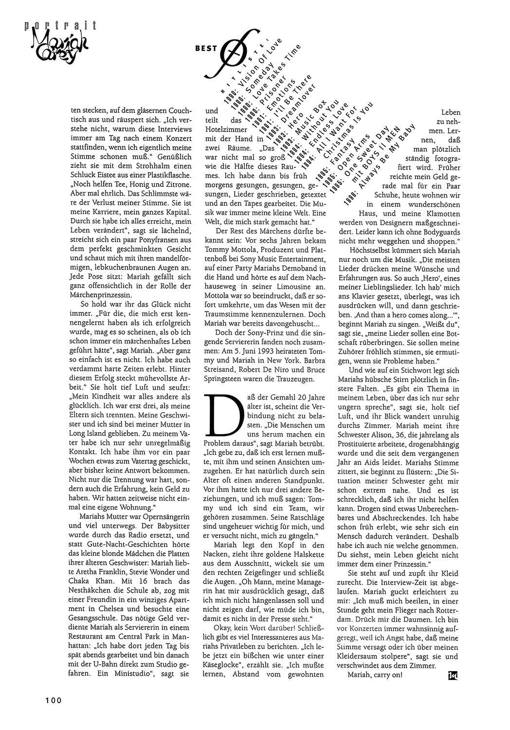 Mariahs Mutter war Opernsängerin und viel unterwegs. Der Babysitter wurde durch das Radio ersetzt, und statt Gute-Nacht-Geschichten hörte das kleine blonde Mädchen die Platten ihrer älteren Geschwister: Mariah liebte Aretha Franklin, Stevie Wonder und Chaka Khan. Mit 16 brach das Nesthäkchen die Schule ab, zog mit einer Freundin in ein winziges Apartment in Chelsea und besuchte eine Gesangsschule. Das nötige Geld verdiente Mariah als Serviererin in einem Restaurant am Central Park in Manhattan: “Ich habe dort jeden Tag bis spät abends gearbeitet und bin danach mit der U-Bahn direkt zum Studio gefahren. Ein Ministudio,” sagt sie und teilt das Hotelzimmer mit der Hand in zwei Räume. “Das war nicht mal so groß wie die Hälfte dieses Raumes. Ich habe dann bis früh morgens gesungen, gesungen, gesungen, Lieder geschrieben, getextet und an den Tapes gearbeitet. Die Musik war immer meine kleine Welt. Eine Welt, die mich stark gemacht hat.”
