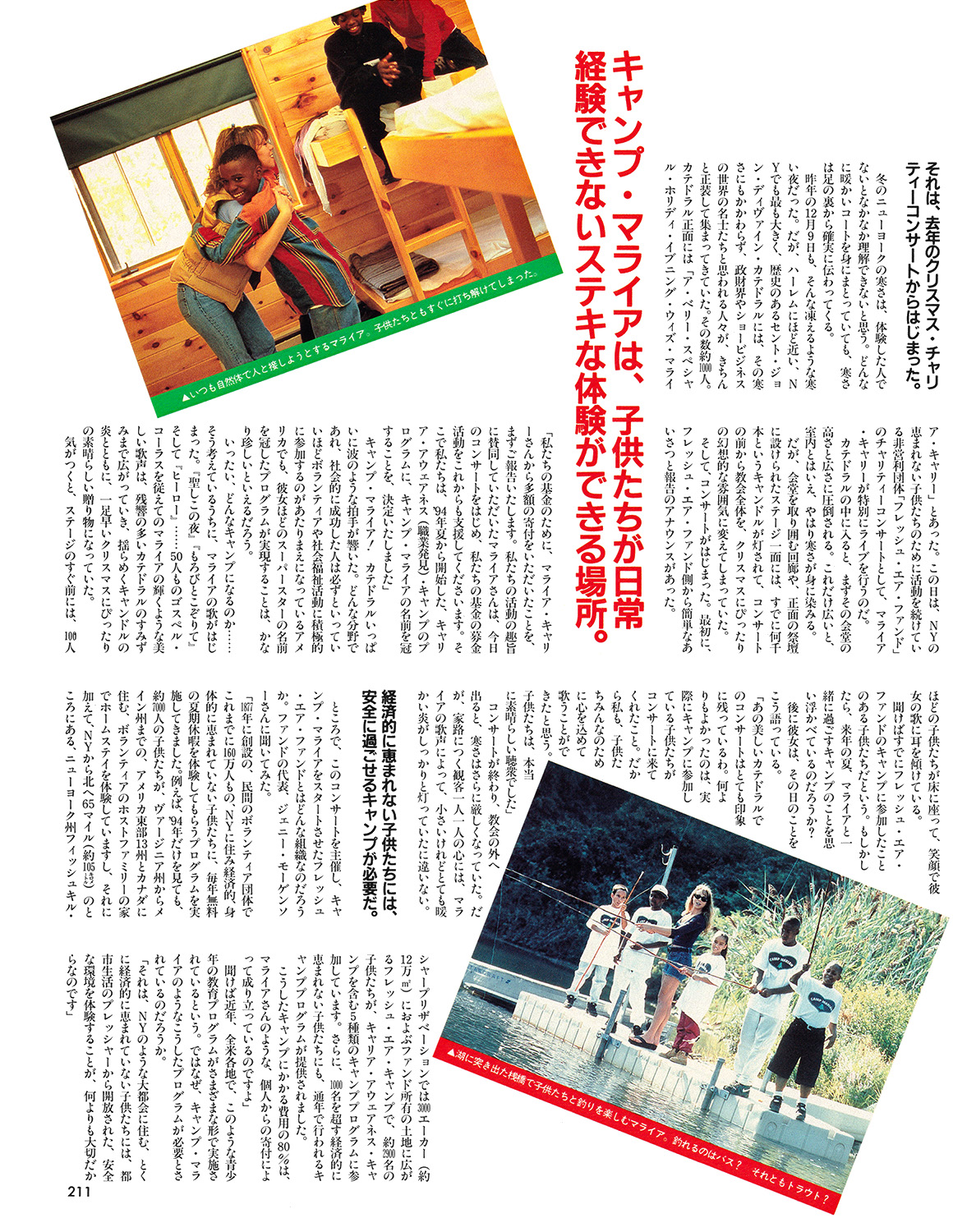 最も大きな中央の建物は、高さ数ir1はあろうかという大きな窓を持ち、キャンプの集会場や大教室、そして食堂として使われている。このほか、敷地内にはログキャビンがいくつも点在しており、それぞれ、コンピューター、ビデオスタジオ、写真、音楽、ファッションなどそれぞれの職業を知るための授業に応じた設備が建物ごとに整っている。これから毎年、12~15歳の子供たちが豊かな自然の中で新たな職業の可能性や社会とのかかわり方を学んでいくことになる。そんな機会をくれたマライアに感謝の意を込めて、子供たちはセレモニーの最後に、彼女のヒット曲『ヒーロー』を合唱した。それを聴くマライアの目には、光るものがあった。でも、それは、自分の夢が実現した、とても満足そうな沢だったのだ。