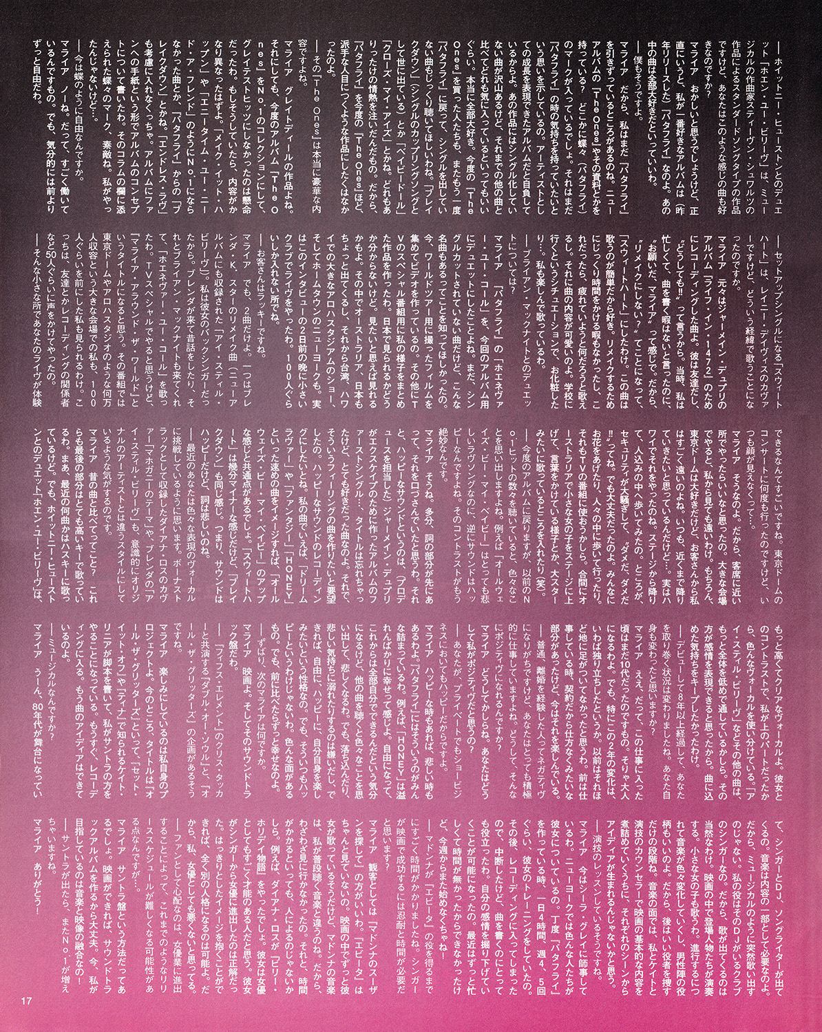 だから、私はまだ「バタフライ」を引きずっているところがあるのね。ニューアルバムの『The Ones』やその資料とかを持っている?どこかに蝶々(バタフライ)のマークが入っているでしょ。それはまだ「バタフライ」の時の気持ちを持っていたいという思いを示しているの。アーティストとしての成長を表現できたアルバムだと自負しているからよ。あの作品にはシングル化していない曲が沢山あるけど、それまでの他の曲と比べてどれも気に入っているといってもいいぐらい。本当に全部大好き。今度の『The Ones』を買った人たちも、またもう一度『バタフライ』に戻って、シングルを出していない曲もじっくり聴いてほしいわね。「ブレイクダウン」(シングルのカップリングソングとして世に出ている)とか「ベイビードール」