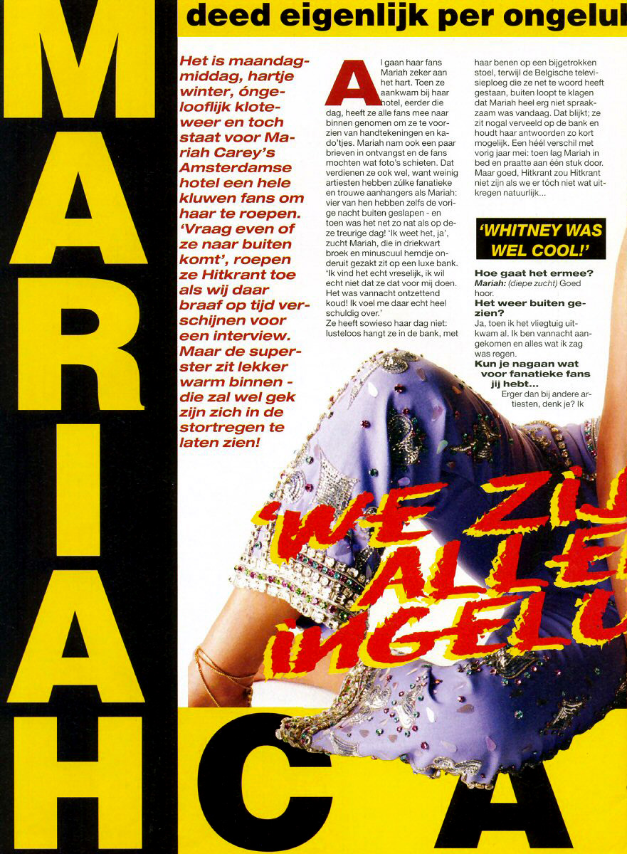 Ze heeft sowieso haar dag niet: lusteloos hangt ze in de bank, met haar benen op een bijgetrokken stoel, terwijl de Belgische televisieploeg die ze net te woord heeft gestaan, buiten loopt te klagen dat Mariah heel erg niet spraakzaam was vandaag. Dat blijkt; ze zit nogal verveeld op de bank en houdt haar antwoorden 20 kort mogelijk. Een héél verschil met vorig jaar mei: toen lag Mariah in bed en praatte aan één stuk door. Maar goed, Hitkrant zou Hitkrant niet zijn als we er tóch niet wat uit Kregen natuurlijk…