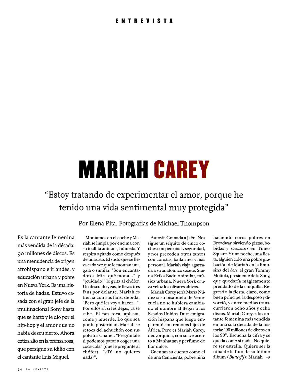 Cuentan su cuento como el de una Cenicienta, pobre niña haciendo coros pobres en Broadway, sirviendo pizzas, bebidas y souvenirs en Times Square. Y una noche, una fiesta, alguien coló una pobre grabación de Mariah en la limusina del boss: el gran Tommy Mottola, presidente de la Sony, que quedaría mágicamente prendado de la chiquilla. Regresó a la fiesta, claro, como buen príncipe: la desposó y divorció, y entre medias transcurrieron ocho años y ocho discos. Mariah Carey es la cantante femenina más vendida en una sola década de la historia: “90 millones de discos en los 90.” Escucha la cifra y se queda como si nada. No quiere ser estrella. Quiere ser la niña de la foto de su último álbum (Butterfly): Mariah niña y Mariah Carey sobre la arena de la playa. La misma.