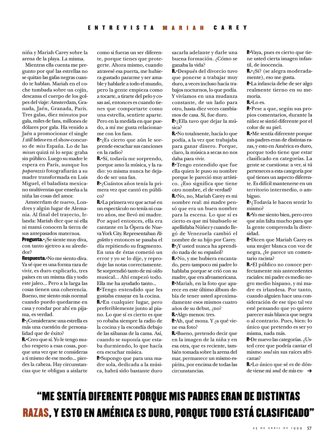 No, no, Mariah Carey es mi nombre real: mi madre pensó que era un buen nombre para la escena. Lo que sí es cierto es que mi bisabuelo se apellidaba Núñez y cuando llegó de Venezuela cambió el nombre de su hijo por Carey.