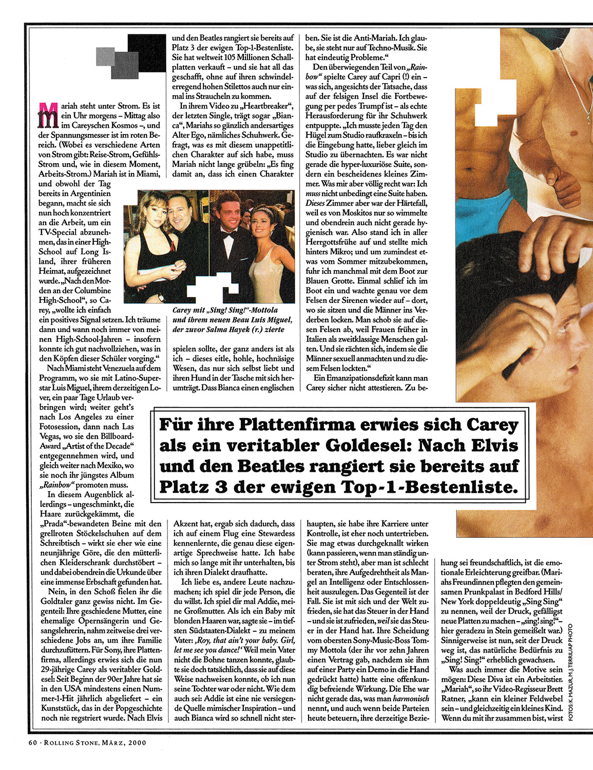 Mariah steht unter Strom. Es ist ein Uhr morgens — Mittag also im Careyschen Kosmos —, und der Spannungsmesser ist im roten Bereich. (Wobei es verschiedene Arten von Strom gibt: Reise-Strom, Gefühls-Strom und, wie in diesem Moment, Arbeits-Strom.) Mariah ist in Miami, und obwohl der Tag bereits in Argentinien begann, macht sie sich nun hoch konzentriert an die Arbeit, um ein TV-Special abzunehmen, das in einer High-School auf Long Island, ihrer früheren Heimat, aufgezeichnet wurde. “Nach den Morden an der Columbine High-School,” so Carey, “wollte ich einfach ein positives Signal setzen. Ich träume dann und wann noch immer von meinen High-School-Jahren — insofern konnte ich gut nachvollziehen, was in den Köpfen dieser Schüler vorging.”