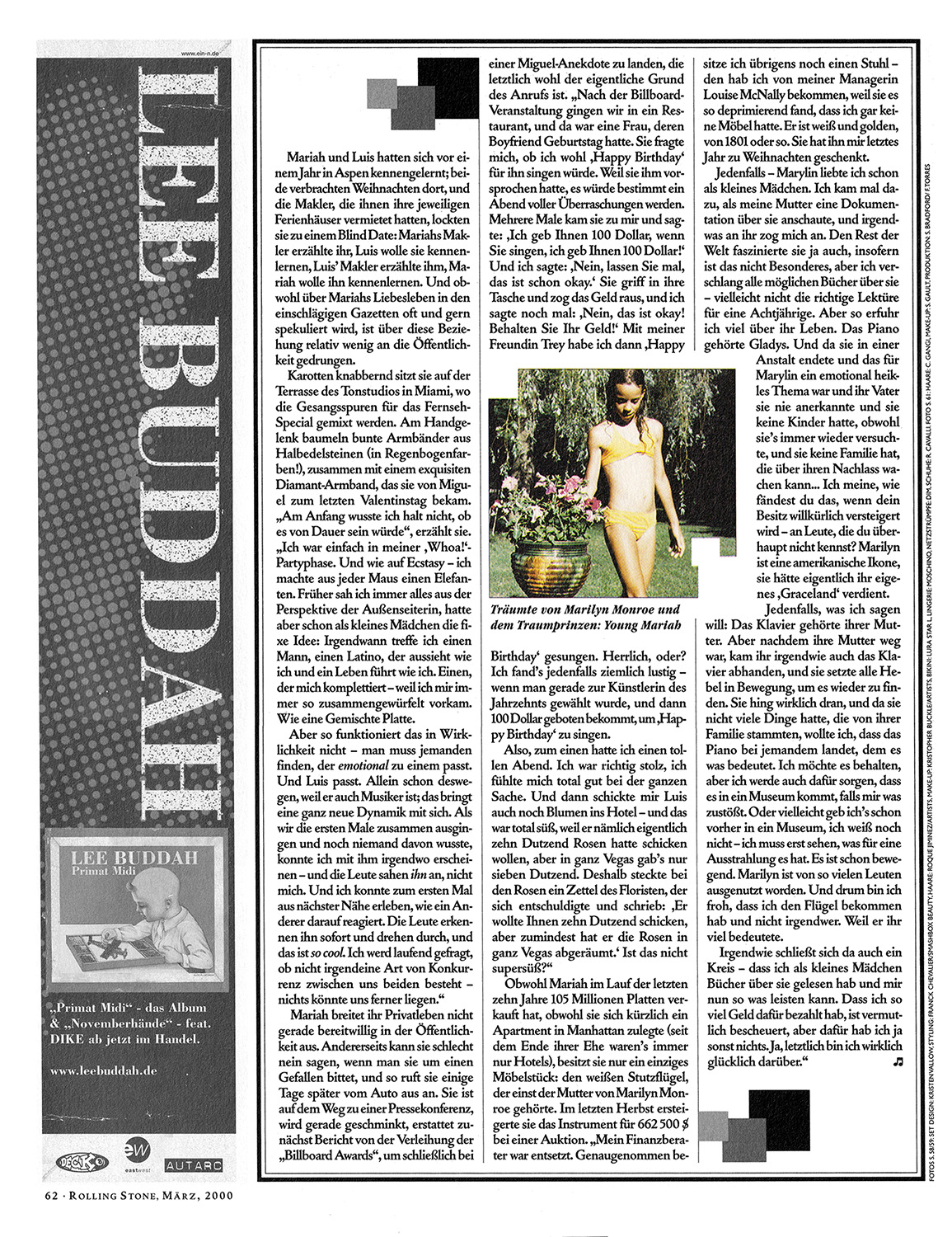 Mariah breitet ihr Privatleben nicht gerade bereitwillig in der Öffentlichkeit aus. Andererseits kann sie schlecht nein sagen, wenn man sie um einen Gefallen bittet, und so ruft sie einige lage später vom Auto aus an. Sie ist auf dem Weg zu einer Pressekonferenz, wird gerade geschminkt, erstattet zunächst Bericht von der Verleihung der “Billboard Awards,” um schließlich bei einer Miguel-Anekdote zu landen, die letztlich wohl der eigentliche Grund des Anrufs ist. “Nach der Billboard-Veranstaltung gingen wir in ein Restaurant, und da war eine Frau, deren Boyfriend Geburtstag hatte. Sie fragte mich, ob ich wohl ‘Happy Birthday’ für ihn singen würde. Weil sie ihm vorsprochen hatte, es würde bestimmt ein Abend voller Überraschungen werden. Mehrere Male kam sie zu mir und sagte: ‘Ich geb Ihnen 100 Dollar, wenn Sie singen, ich geb Ihnen 100 Dollar!’ Und ich sagte: ‘Nein, lassen Sie mal, das ist schon okay.’ Sie griff in ihre Tasche und zog das Geld raus, und ich sagte noch mal: ‘Nein, das ist okay! Behalten Sie Ihr Geld!’ Mit meiner Freundin Trey habe ich dann ‘Happy Birthday’ gesungen. Herrlich, oder? Ich fand's jedenfalls ziemlich lustig — wenn man gerade zur Künstlerin des Jahrzehnts gewählt wurde, und dann 100 Dollar geboten bekommt, um ‘Happy Birthday’ zu singen.