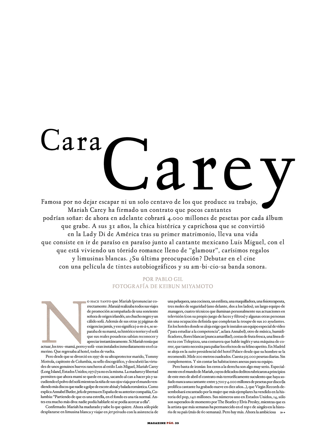 Pero basta de ironías: los ceros a la derecha son algo muy serio. Especialmente en el mundo de Mariah, cuyos delicados deditos rubricaron a principios de este mes de abril el contrato más terroríficamente suculento que haya soñado nunca una cantante: entre 3.700 y 4.000 millones de pesetas por disco (la prolífica cantante ha grabado nueve en diez años…), que Virgin Records desembolsará encantado por la mujer que más ejemplares ha vendido en la historia del pop, 140 millones. Sus números uno en Estados Unidos, 14, sólo son superados de momento por The Beatles y Elvis Presley, mientras que es la artista que más semanas ha permanecido en el top 1 de singles en la historia de su país (más de 6o semanas). Pero hay más. Ahora la ambiciosa chavala quiere ser actriz, y por eso ha organizado (entiéndase, producido) una película de tintes autobiográficos, All that Glitters (Todos esos brillos), para la que ha rematado la banda sonora en el estudio malacitano El Cortijo.