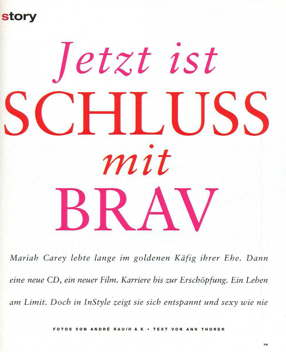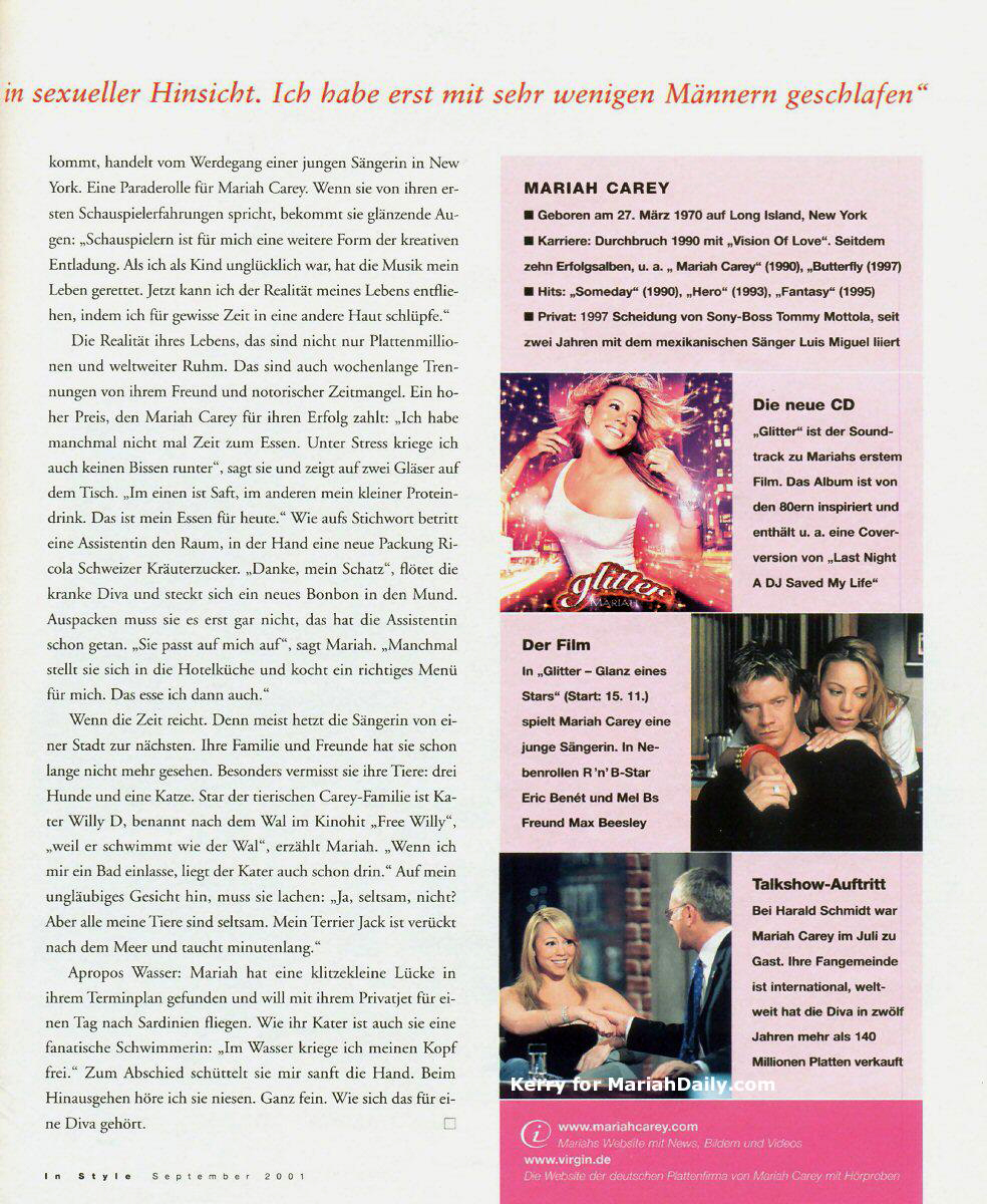 Eine Suite im feinen Berliner Hotel “Ritz-Carlton,” Die schwerren Vorhänge sind zugezogen, auf dem Sofatisch stapeln sich Kleenex-Packungen, Taschentücher, Hustenbonbons. Eine Kerze verströmt ein Duftgemisch aus Vanille und Fichtennadeln. Ein edles Krankenlager. Der Patient liegt aber nicht dick eingemummelt im Bett, sondern sitzt in knappen Jeans-Hotpants, dünnem Unterhemdchen und mit zehn Zentimeter hohen goldenen Stilettos auf dem Sofa. Mariah Carey ist erkältet. Allerdings sind Divas anders erkältet als Normalsterbliche: Bis auf die leicht gerötete Nase ist die Sängerin trotzdem so perfekt gestylt wie ein Supermodel kurz vor dem Covershooting. “Hallo, schön dass Sie da sind,” sagt sie mit leicht heiserer Stimme, schüttelt kurz meine Hand, um sie dann ganz schnell wieder auf das dicke Kissen auf ihrem Bauch zu legen, das sie an sich drückt wie eine Wärmflasche. Dass Mariahs Immunsystem im Moment labil ist, ist kein Wunder: 2001 ist für die 31-jährige Sängerin mit der Vieroktavenstimme ein anstrengendes Jahr: Sie gab ihr Schauspieldebüt im 80er-Jahre-Musikfilm Glitter — Glanz eines Stars, sie hat ihren zweiten Film Wise Girls an der Seite von Oscar-Preisträgerin Mira Sorvino gerade abgedreht und sie veröffentlicht dazu noch ein neues Album.