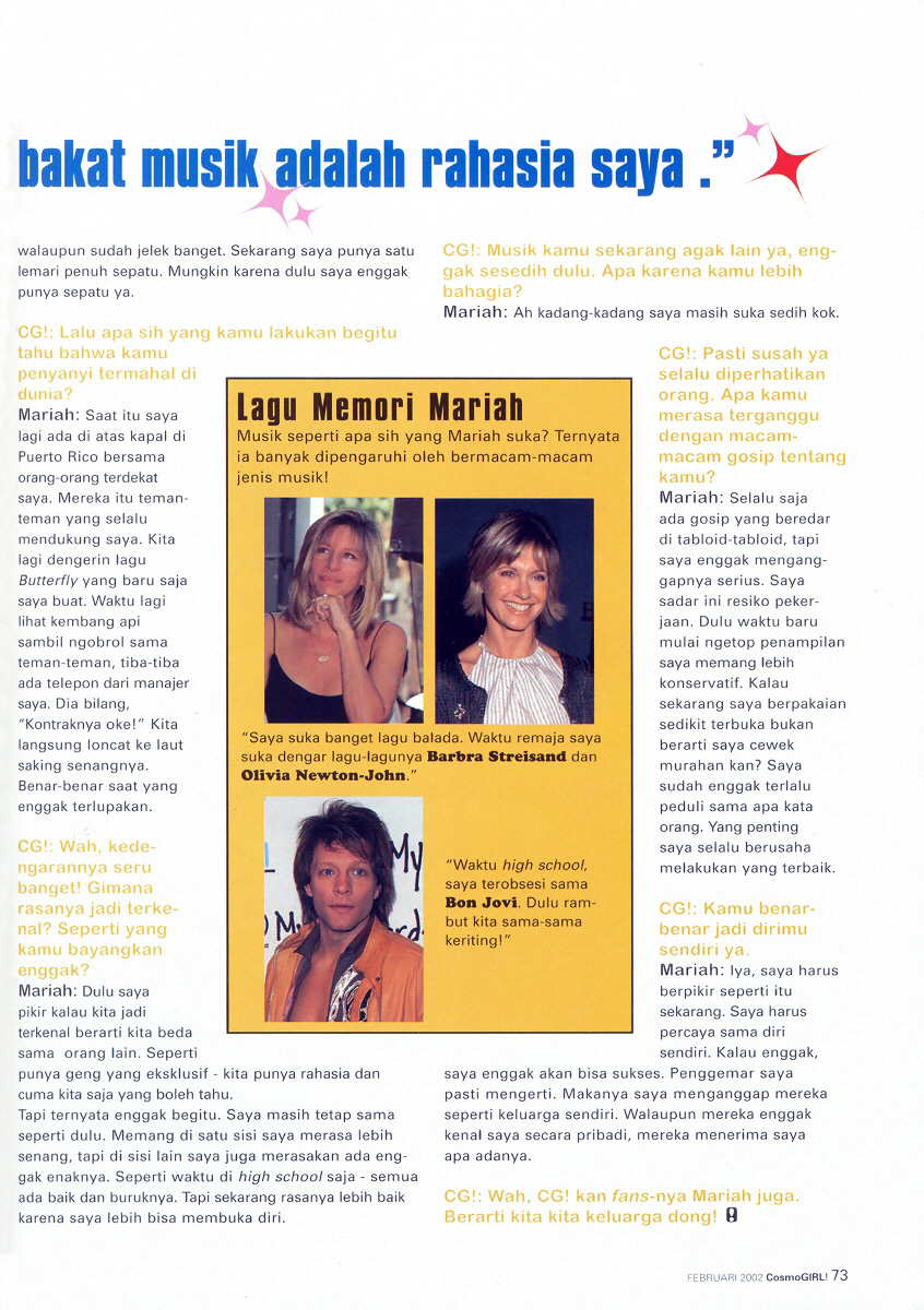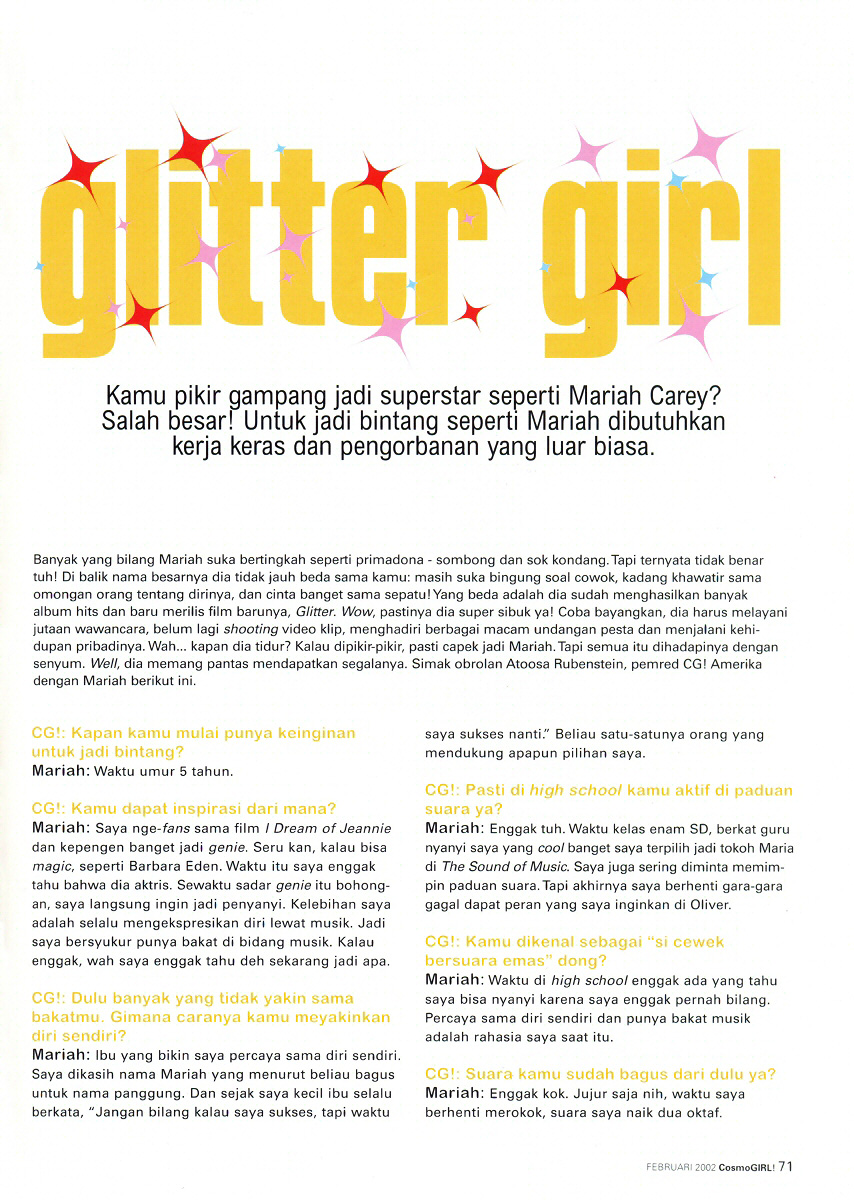 Banyak yang bilang Mariah suka bertingkah seperti primadona — sombong dan sok kondang. Tapi ternyata tidak benar tuh! Di balik nama besarnya dia tidak jauh beda sama kamu: masih suka bingung soal cowok, kadang khawatir sama omongan orang tentang dirinya, dan cinta banget sama sepatu! Yang beda adalah dia sudah menghasilkan banyak album hits dan baru merilis film barunya, Glitter. Wow, pastinya dia super sibuk ya! Coba bayangkan, dia harus melayani jutaan wawancara, belum lagi shooting video klip, menghadiri berbagai macam undangan pesta dan menjalani kehidupan pribadinya. Wah… kapan dia tidur? Kalau dipikir-pikir, pasti capek jadi Mariah. Tapi semua itu dihadapinya dengan senyum. Well, dia memang pantas mendapatkan segalanya. Simak obrolan Atoosa Rubenstein, pemred CG! Amerika dengan Mariah berikut ini.