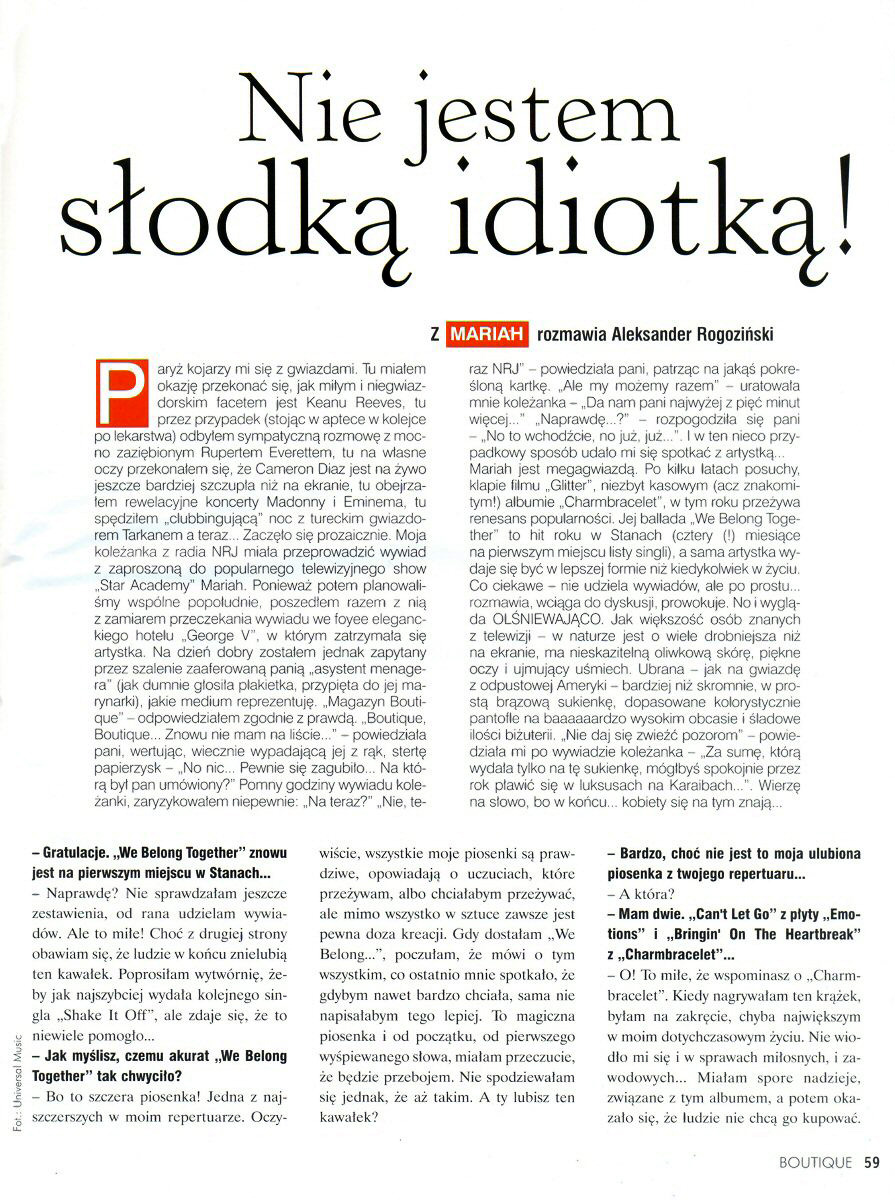 Paryż kojarzy mi się z gwiazdami. Tu miałem okazję przekonać się, jak miłym i niegwiazdorskim facetem jest Keanu Reeves, tu przez przypadek (stojąc w aptece w kolejce po lekarstwa) odbyłem sympatyczną rozmowę z mocno zaziębionym Rupertem Everettem, tu na własne oczy przekonałem się, że Cameron Diaz jest na żywo jeszcze bardziej szczupła niż na ekranie, tu obejrzałem rewelacyjne koncerty Madonny i Eminema, tu spędziłem “clubbingującą” noc z tureckim gwiazdorem Tarkanem a teraz… Zaczęło się prozaicznie. Moja koleżanka z radia NRJ miała przeprowadzić wywiad z zaproszoną do popularnego telewizyjnego show Star Academy Mariah. Ponieważ potem planowaliśmy wspólne popołudnie, poszedłem razem z nią z zamiarem przeczekania wywiadu we foyee eleganckiego hotelu George V, w którym zatrzymała się artystka. Na dzień dobry zostałem jednak zapytany przez szalenie zaaferowaną panią “asystent menagera” (jak dumnie głosiła plakietka, przypięta do jej marynarki), jakie medium reprezentuję. “Magazyn Boutique” … odpowiedziałem zgodnie z prawdą. “Boutique, Boutique… Znowu nie mam na liście…” — powiedziała pani, wertując, wiecznie wypadającą jej z rąk, stertę papierzysk — “No nic… Pewnie się zagubiło… Na którą byl pan umówiony?” Pomny godziny wywiadu koleżanki, zaryzykowałem niepewnie: “Na teraz?” “Nie, teraz NRJ” — powiedziała pani, patrząc na jakąś pokreśloną kartkę. “Ale my możemy razem” — uratowała mnie koleżanka — “ Da nam pani najwyżej z pięć minut więcej…” “Naprawdę…?” — rozpogodziła się pani — “No to wchodźcie, no już, już&hellip” I w ten nieco przypadkowy sposób udało mi się spotkać z artystką…