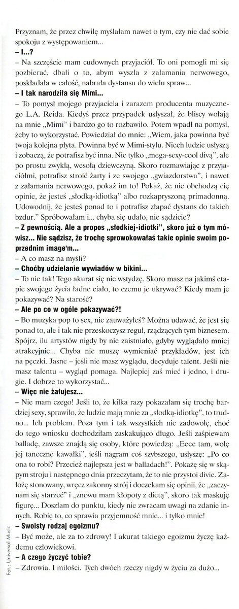 Nie mam czego! Jeśli to, że kilka razy pokazałam się trochę bardziej sexy, sprawiło, że ludzie mają mnie za “słodką-idiotkę,” to trudno… Ich problem. Poza tym i tak wszystkich nie zadowolę, choć do tego wniosku dochodziłam zaskakująco długo. Jeśli zaśpiewam balladę, zawsze znajdą się osoby, które powiedzą: “Eeee tam, wolę jej taneczne kawałki,” jeśli nagram coś szybszego, usłyszę: “Po co ona to robi? Przecież najlepsza jest w balladach!.” Pokażę się w skąpym stroju i następnego dnia przeczytam, że to nie przystoi divie. Za łożę stonowany, wręcz zakonny strój i doczekam się opinii, że “zaczynam się starzeć” i “znowu mam kłopoty z dietą,” skoro tak maskuję figurę… Doszłam do punktu, kiedy nie zwracam uwagi na zdanie innych. Robię to, co sprawia przyjemność mnie… i tylko mnie!