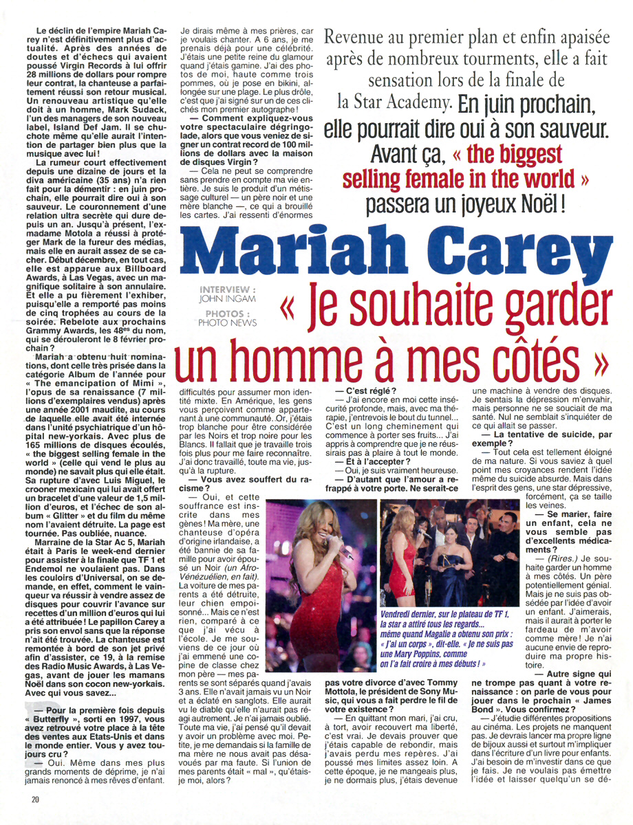 Marraine de la Star Ac 5, Mariah était à Paris le week-end dernier pour assister à la finale que TF1 et Endemol ne voulaient pas. Dans les couloirs d'Universal, on se demande, en effet, comment le vainqueur va réussir a vendre assez de disques pour couvrir l'avance sur recettes d'un million d'euros qui lui a été attribuée ! Le papillon Carey a pris son envol sans que la réponse n'ait été trouvée. La chanteuse est remontée à bord de son jet privé afin d'assister, ce 19, à la remise des Radio Music Awards, à Las Ve-gas, avant de jouer les mamans Noël dans son cocon new-yorkais. Avec qui vous savez…