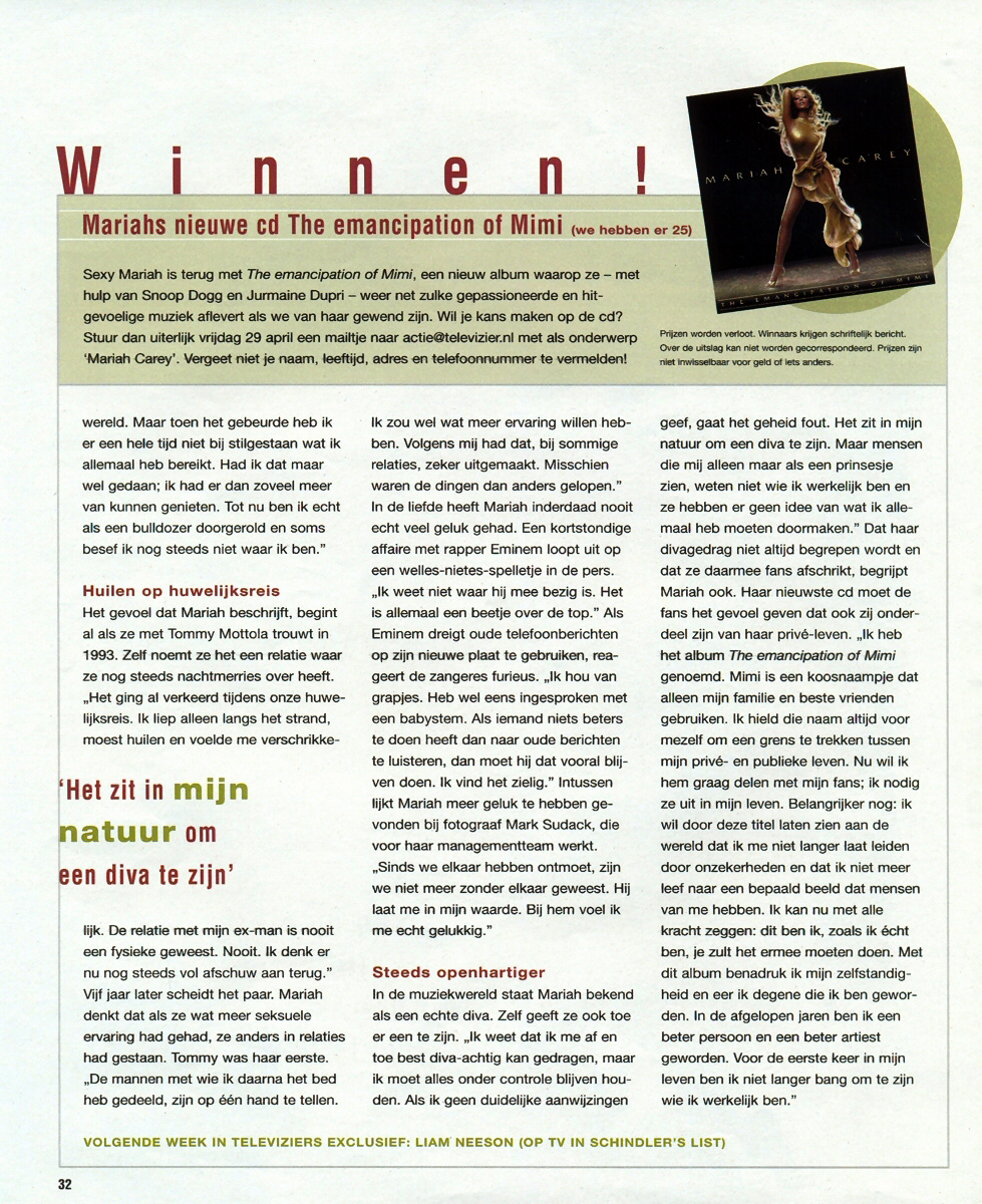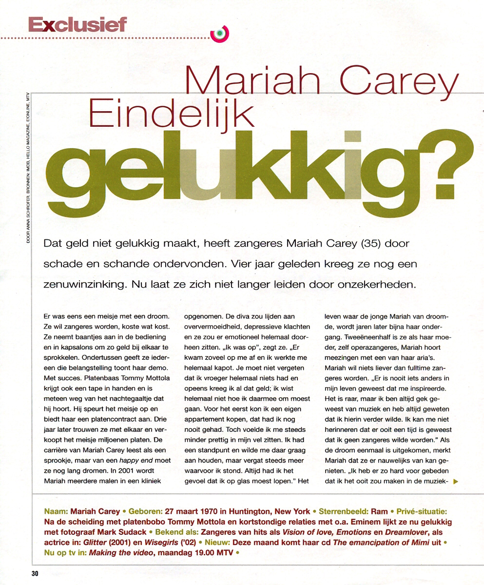 In de liefde heeft Mariah inderdaad nooit echt veel geluk gehad. Een kortstondige affaire met rapper Eminem loopt uit op een welles-nietes-spelletje in de pers. “Ik weet niet waar hij mee bezig is. Het is allemaal een beetje over de top.” Als Eminem dreigt oude telefoonberichten op zijn nieuwe plaat te gebruiken, reageert de zangeres furieus. “Ik hou van grapjes. Heb wel eens ingesproken met een babystem. Als iemand niets beters te doen heeft dan naar oude berichten te luisteren, dan moet hij dat vooral blijven doen. Ik vind het zielig.” Intussen lijkt Mariah meer geluk te hebben gevonden bij fotograaf Mark Sudack, die voor haar managementteam werkt. “Sinds we elkaar hebben ontmoet, zijn we niet meer zonder elkaar geweest. Hij laat me in mijn waarde. Bij hem voel ik me echt gelukkig.”