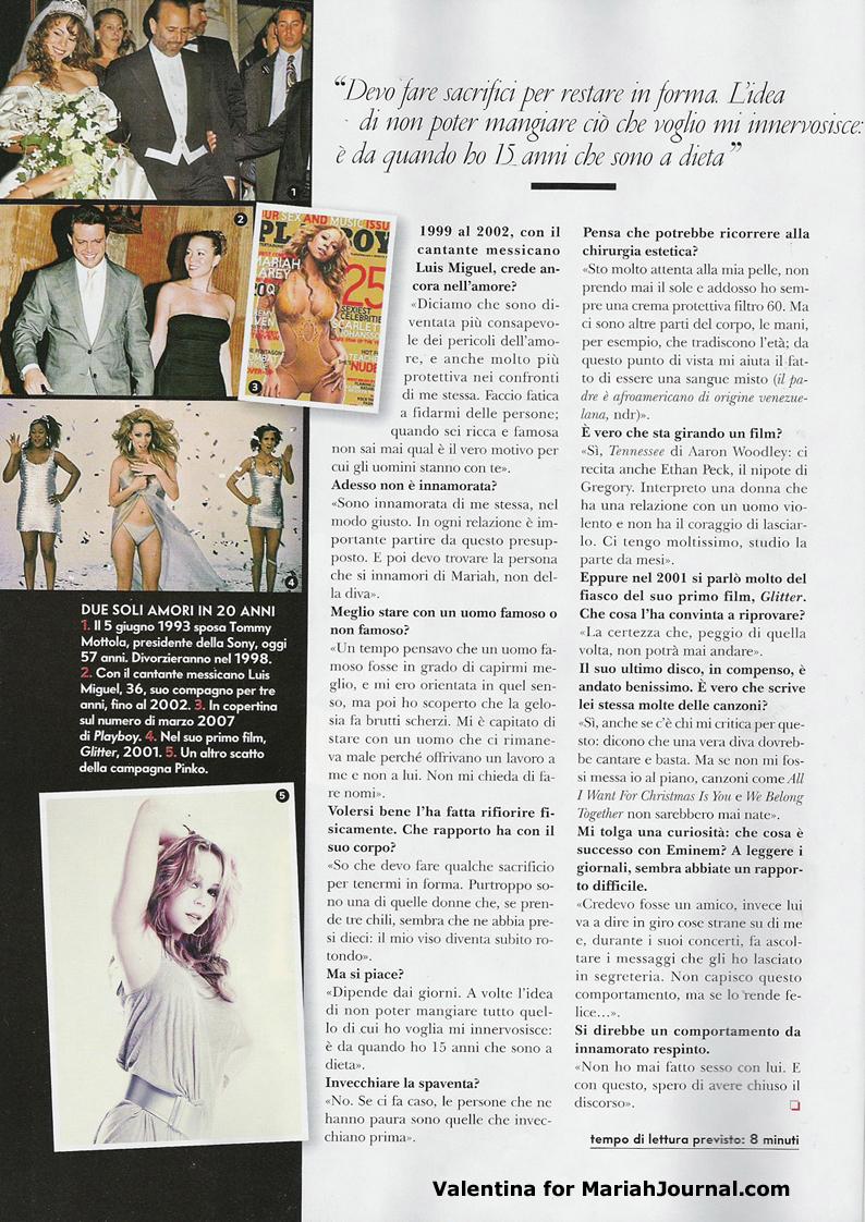 Mariah Carey, 37 anni, è sulla copertina del numero di marzo di Playboy. Non nuda, però. Indossa me da bagno intero e molto scollato, mostrando un fisico sorprendente per una donna che, poco più di cinque anni fa, aveva toccato — fisicamente e psicologicamente — il fondo. Dopo essere stata una delle cantanti pop più amate degli anni Novanta (ha venduto oltre 210 milioni di dischi ed è l'interprete femminile con più -ldquo;numeri uno” nella classifica di Billboard, uguagliando il record di Elvis Presley), nel 2001 aveva infatti avuto un esaurimento che l'aveva costretta al ricovero. La rinascita è avvenuta due anni fa, grazie al successo di The Emancipation Of Mimi, il disco di musica R&B con testi autobiografici che contiene la ascoltatissima “We Belong Together,” e che le è valso 6 dischi di platino e tre Grammys. La incontriamo a Londra alla festa organizzata in suo onore da Pinko, il marchio di abbigliamento italiano che l'ha scelta