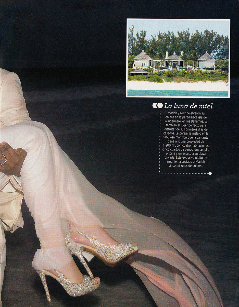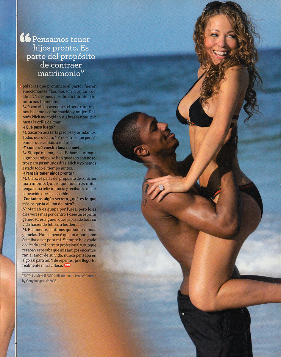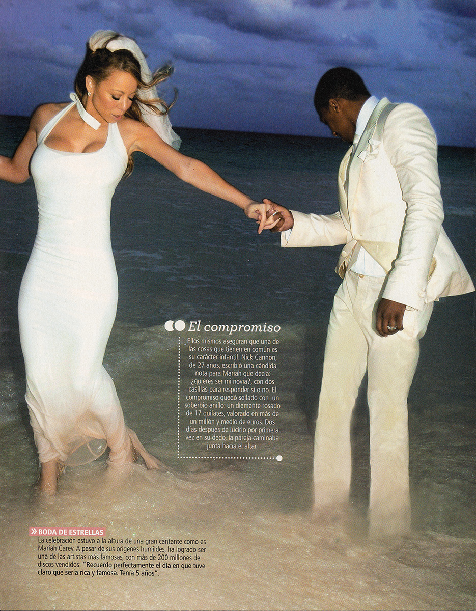 Mariah: Solamente se lo dijimos a cuatro personas. El resto pensaba que nos íbamos a las Bahamas a grabar un vídeo. Cuando llegamos a la isla, me organizaron una despedida de soltera. Se esforzaron mucho por sorprenderme; me entregaron una bolsa entera llena de cosas absurdas que se suele regalar a las novias. Y todos estaban encantados porque consiguieron avergonzarme. Mis amigos suelen llamarme Mary Poppins, porque, a pesar de lo provocativo que pueda ser mi vestuario, yo soy muy puritana.