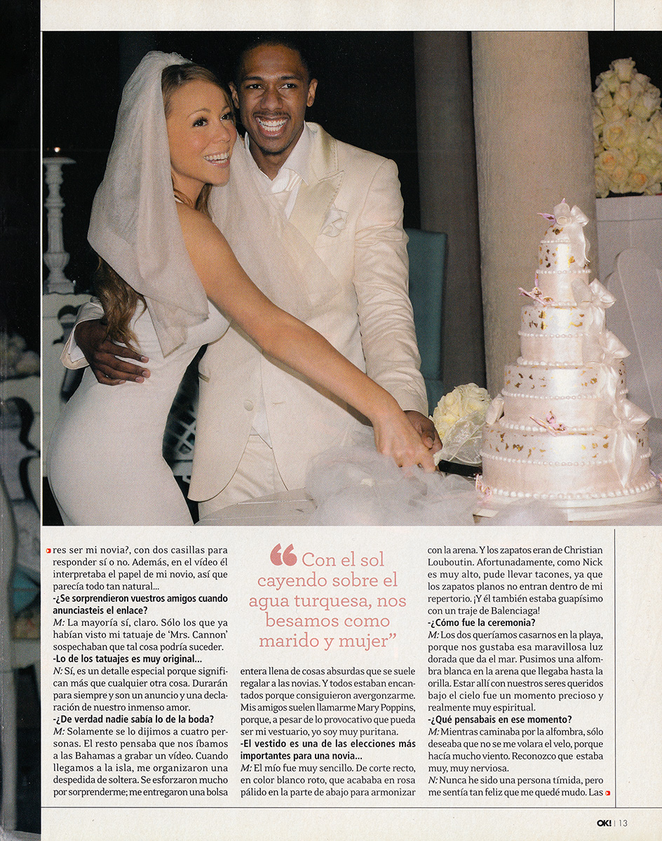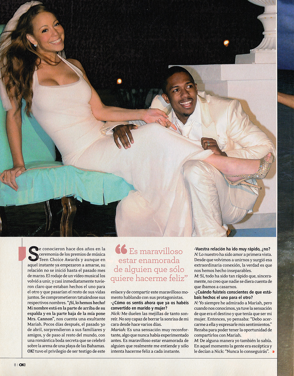Se conocieron hace dos años en la ceremonia de los premios de música Teen Choice Awards y aunque en aquel instante ya empezaron a amarse, su relación no se inició hasta el pasado mes de marzo. El rodaje de un vídeo musical los volvió a unir, y casi inmediatamente tuvieron claro que estaban hechos el uno para el otro y que pasarían el resto de sus vidas juntos. Se comprometieron tatuándose sus respectivos nombres. “Sí, lo hemos hecho! Mi nombre está en la parte de arriba de su espalda y en la parte baja de la mía pone Mrs. Cannon,” nos cuenta una exultante Mariah. Pocos días después, el pasado 30 de abril, sorprendieron a sus familiares y amigos, y de paso al resto del mundo, con una romántica boda secreta que se celebró sobre la arena de una playa de las Bahamas. OK! tuvo el privilegio de ser testigo de este enlace y de compartir este maravilloso momento hablando con sus protagonistas.