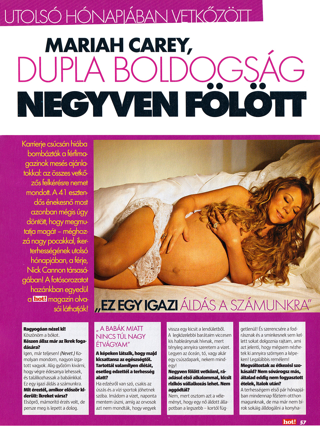 Mindenképpen szerettem volna én is olyan képeket magamról, mint Demi Moore, Claudia Schiffer vagy éppen Monica Bellucci. De nem akartam, hogy pontosan ugyanolyanok legyenek a fotók, mint az “elődeiméi.” Nickkel imádjuk egymást, nem vagyunk szégyenlősek, és ez a legboldogabb szakasz az életünkben. Plusz annak is örültem, hogy a férjem végre mindenkinek megmutathatta a hátán díszelgő tetoválást. A Mariah feliratot az orök szerelme jelképéül varratta magára, csak miattam.