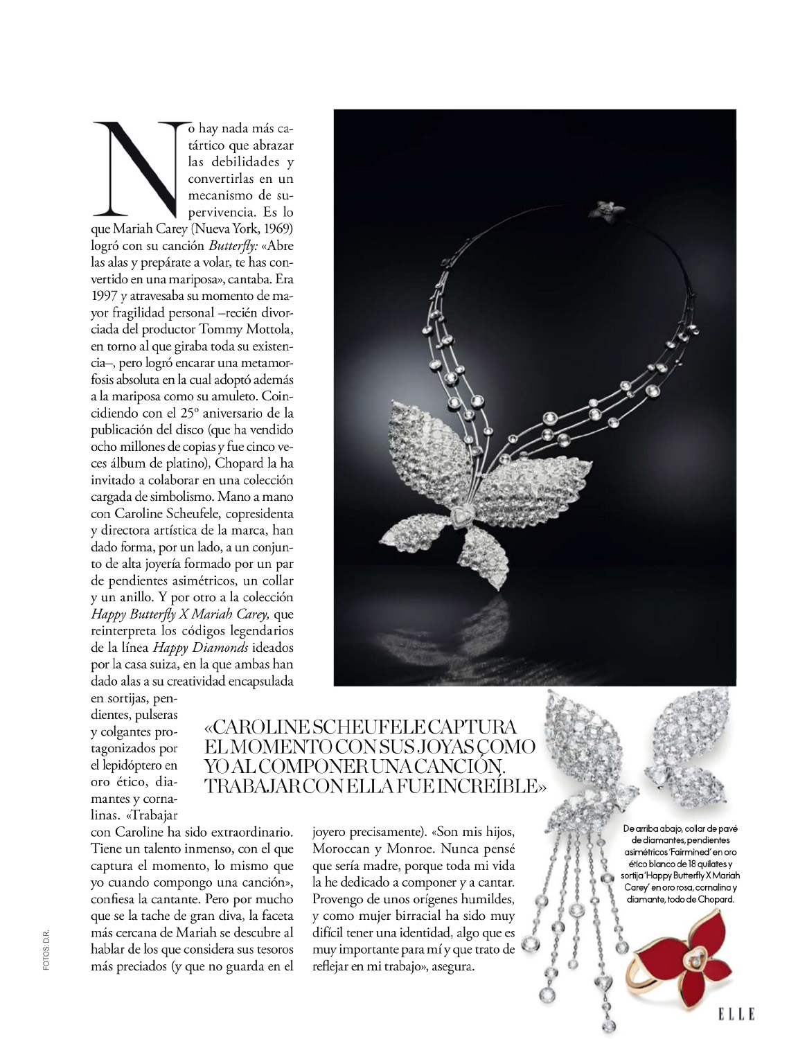 No hay nada más catártico que abrazar las debilidades y convertirlas en un mecanismo de supervivencia. Es lo que Mariah Carey (Nueva York, 1969) logró con su canción “Butterfly”: “Abre las alas y prepárate a volar, te has convertido en una mariposa,” cantaba. Era 1997 y atravesaba su momento de mayor fragilidad personal — recién divorciada del productor Tommy Mottola, en torno al que giraba toda su existencia —, pero logró encarar una metamorfosis absoluta en la cual adoptó además a la mariposa como su amuleto. Coincidiendo con el 25º aniversario de la publicación del disco (que ha vendido ocho millones de copias y fue cinco veces álbum de platino), Chopard la ha invitado a colaborar en una colección cargada de simbolismo. Mano a mano con Caroline Scheufele, copresidenta y directora artística de la marca, han dado forma, por un lado, a un conjunto de alta joyería formado por un par de pendientes asimétricos, un collar y un anillo. Y por otro a la colección Happy Butterfly X Mariah Carey, que reinterpreta los códigos legendarios de la línea Happy Diamonds ideados por la casa suiza, en la que ambas han dado alas a su creatividad encapsulada en sortijas, pendientes, pulseras y colgantes protagonizados por el lepidóptero en oro ético, diamantes y cornalinas. “Trabajar con Caroline ha sido extraordinario. Tiene un talento inmenso, con el que captura el momento, lo mismo que yo cuando compongo una canción,” confiesa la cantante. Pero por mucho que se la tache de gran diva, la faceta más cercana de Mariah se descubre al hablar de los que considera sus tesoros más preciados (y que no guarda en el joyero precisamente). “Son mis hijos, Moroccan y Monroe. Nunca pensé que sería madre, porque toda mi vida la he dedicado a componer y a cantar. Provengo de unos orígenes humildes, y como mujer birracial ha sido muy difícil tener una identidad, algo que es muy importante para mí y que trato de reflejar en mi trabajo,” asegura.