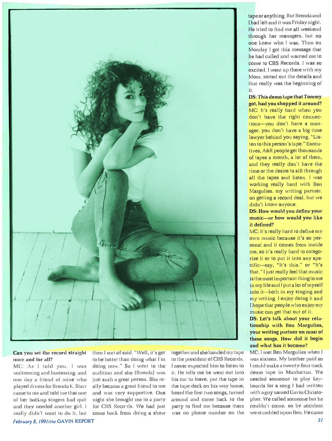 I met Ben Margulies when I was sixteen. My brother paid so I could make a twenty-four track demo tape in Manhattan. We needed someone to play keyboards for a song I had written with a guy named Gavin Christopher. We called someone but he couldn't come, so by accident we stumbled upon Ben. He came to the session, although he really can't play keyboards very well; he's really more of a drummer. It became a big ordeal, but after that day we sort of kept in touch, got together and just sort of clicked as writers. We worked very hard together before we had a record deal, before anyone would listen to my tape or anything, so Ben's been there from the beginning as a believer and he's really a very talented person. Right now I'm writing for my second album. I'm working with some other people and also with Ben.