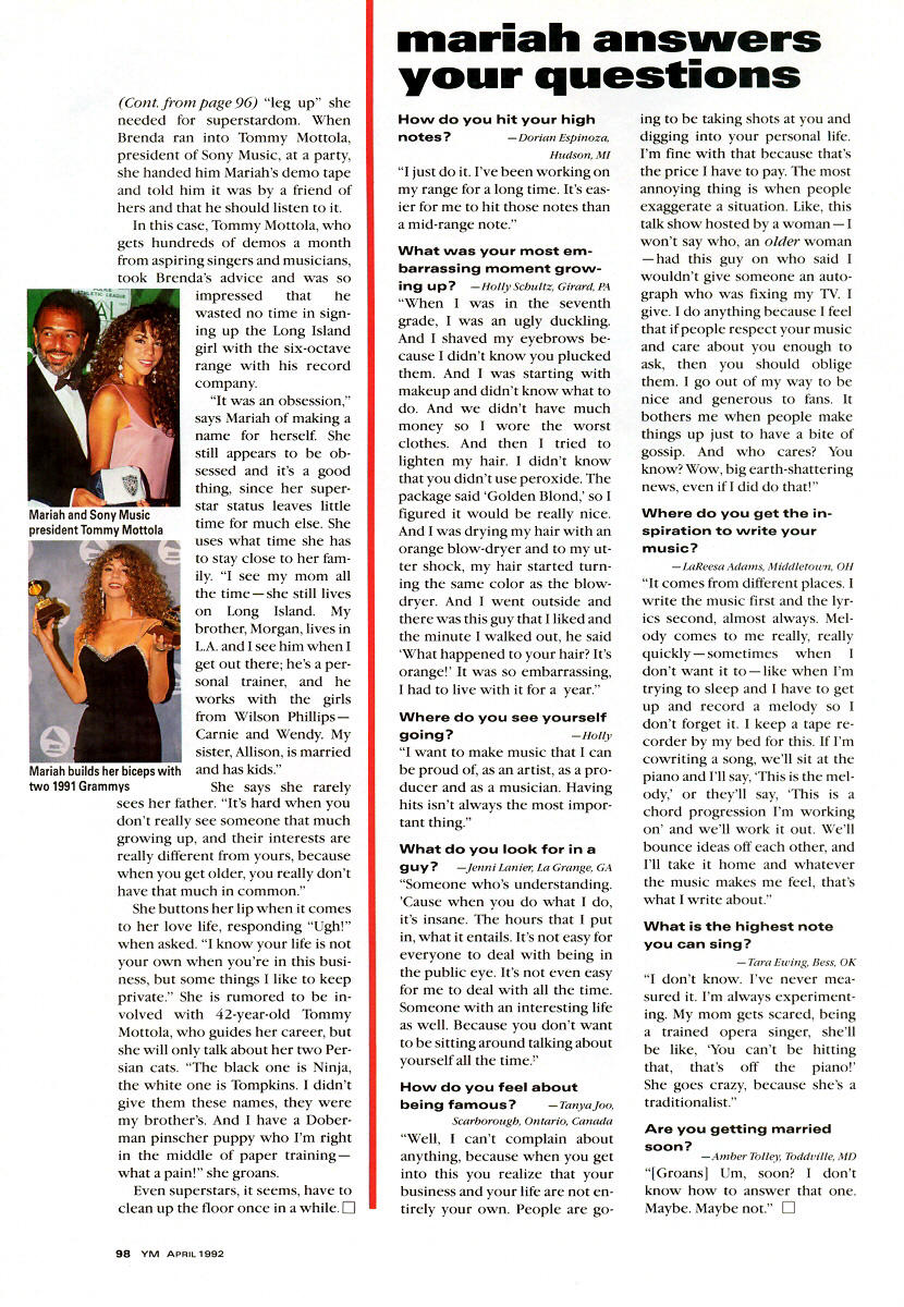But that's okay with her. “There's never been anything else in my life that inspired me at all,” Mariah explains. “It's crazy, but I've always loved music, and I've always knows this was what I wanted to do. I can't remember a time when I didn't want to be a singer. My mom [Patricia] was a professional opera singer, so it wasn't such a pipe dream. It's kind of like going into the family business, but more crazy. I love it. I'm really thankful to be having this success.”