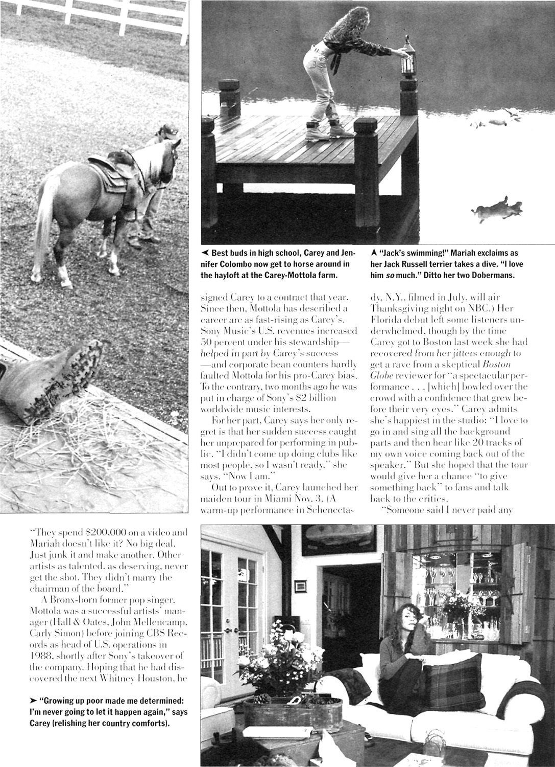 This day Mottola is tending to thornier business in Manhattan, 90 miles away, leaving Carey the run of their baronial Hudson River Valley estate. Its sprawling main house and adjacent guest lodge sit on a hill surrounded by acres of woodlands and mowed pastures near a barn where the couple's four horses are stabled. Of course, no fairy tale is trouble-free, and lurking under Carey's bridge of happiness is a pack of trollish critics who slammed her fourth album, Music Box. Even so, the album ascended quickly into the Top 10, while its first single, the trilling ballad “Dreamlover,” spent two months at No. 1.