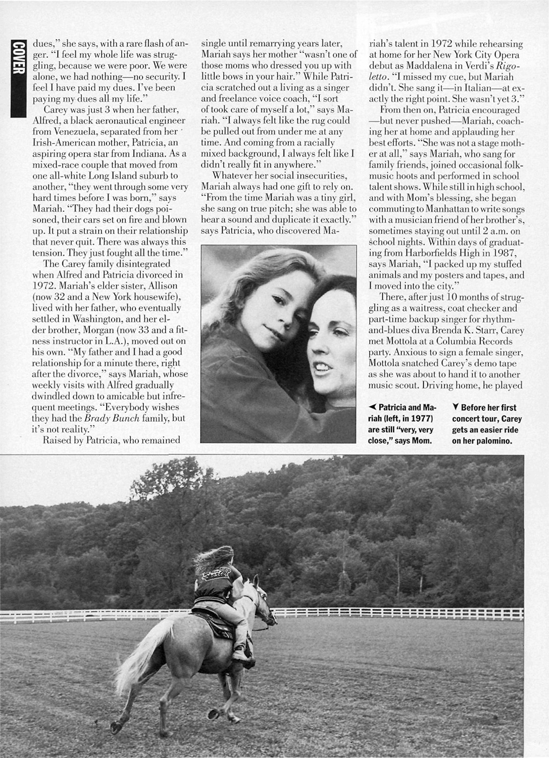 Raised by Patricia, who remained single until remarrying years later, Mariah says her mother “wasn't one of those moms who dressed you up with little bows in your hair.” While Patricia scratched out a living as a singer and freelance voice coach, “I sort of took care of myself a lot,” says Mariah. “I always felt like the rug could be pulled out from under me at any time. And coming from a racially mixed background, I always felt like I didn't really fit in anywhere.”