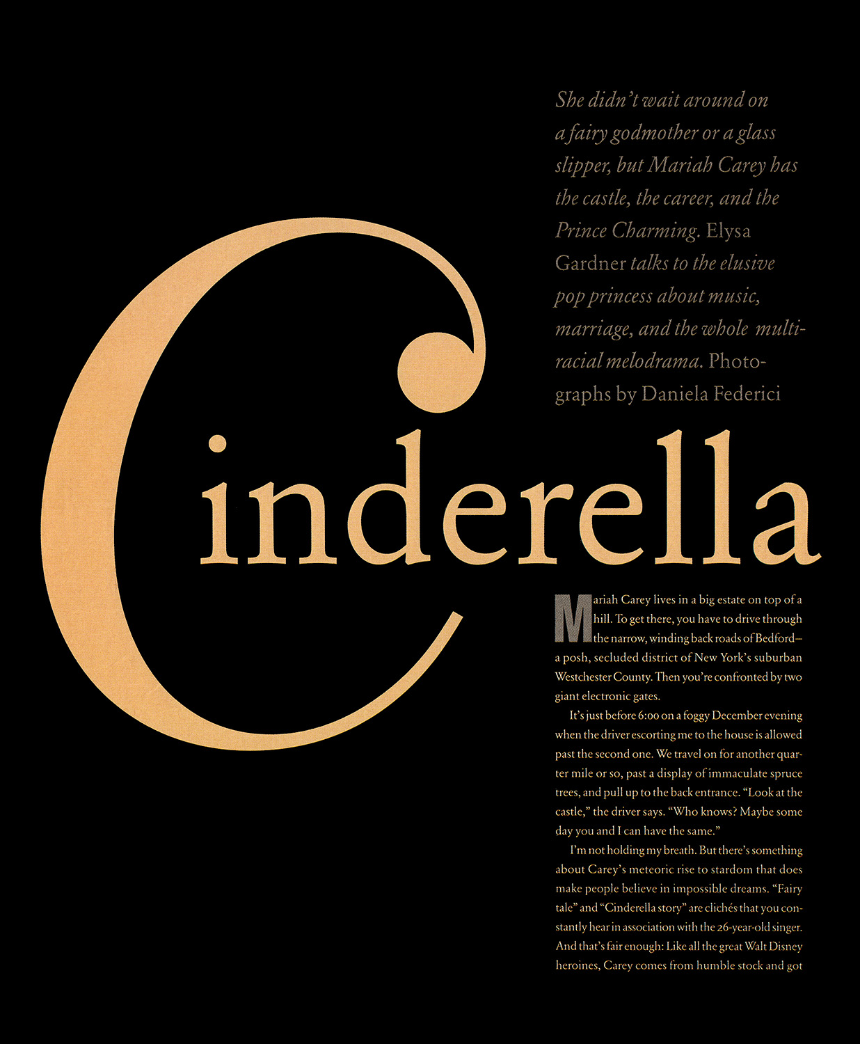I'm not holding my breath. But there's something about Carey's meteoric rise to stardom that does make people believe in impossible dreams. “Fairy tale” and “Cinderella story” are clichés that you constantly hear in association with the 26-year-old singer. And that's fair enough: Like all the great Walt Disney heroines, Carey comes from humble stock and got to where she is through a combination of good luck, good genes, and sheer moxie. As she tells me later, “I think of Cinderella as a poor girl who worked her ass off and became a princess. In that sense, I don't mind the comparison.”